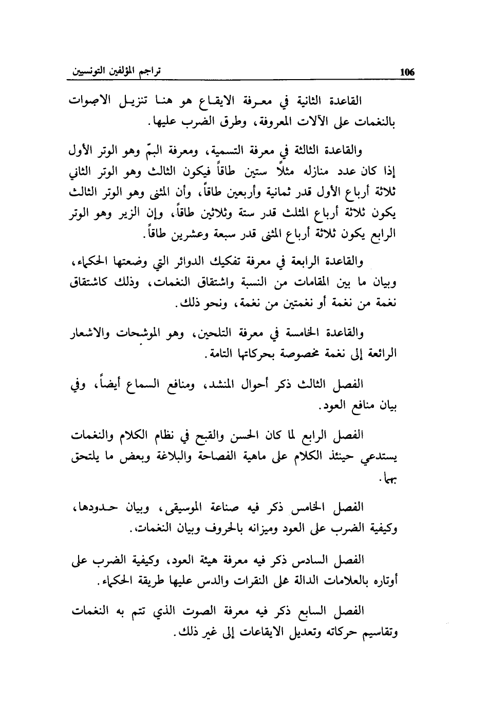 الفصل الخامس ذكر فيه صناعة الموسيقى، وبيان حدودها، وكيفية الضرب على العود وميزانه بالحروف وبيان النغمات.