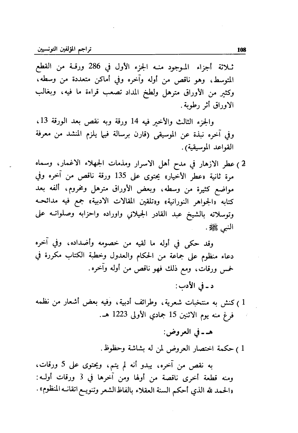 والجزء الثالث والأخير فيه 14 ورقة وبه نقص بعد الورقة 13، وفي آخره نبذة عن الموسيقى (قارن برسالة فيما يلزم المنشد من معرفة القواعد الموسيقية).