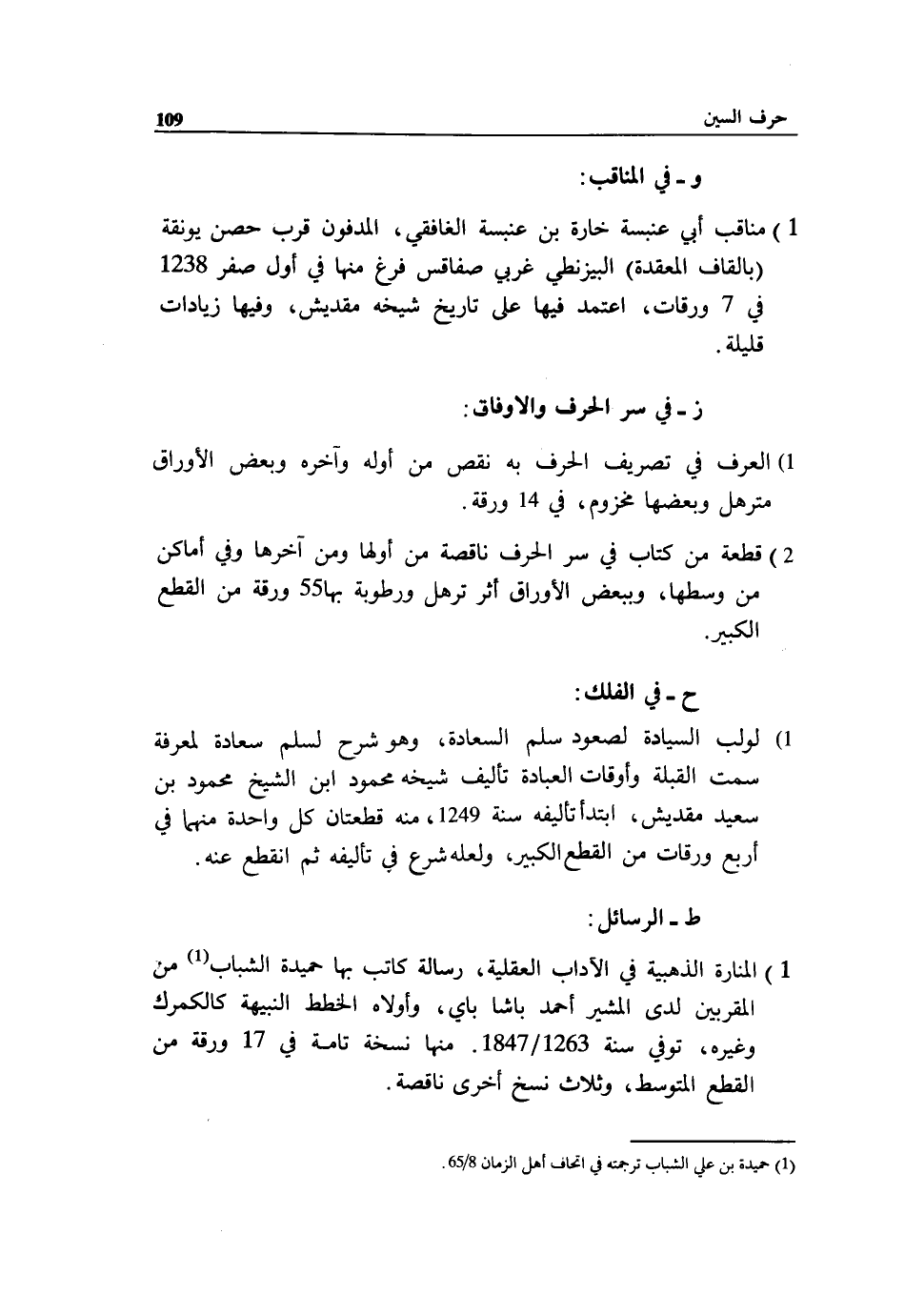 2) قطعة من كتاب في سر الحرف ناقصة من أولها ومن آخرها وفي أماكن من وسطها، وببعض الأوراق أثر ترهل ورطوبة بها 55 ورقة من القطع الكبير.