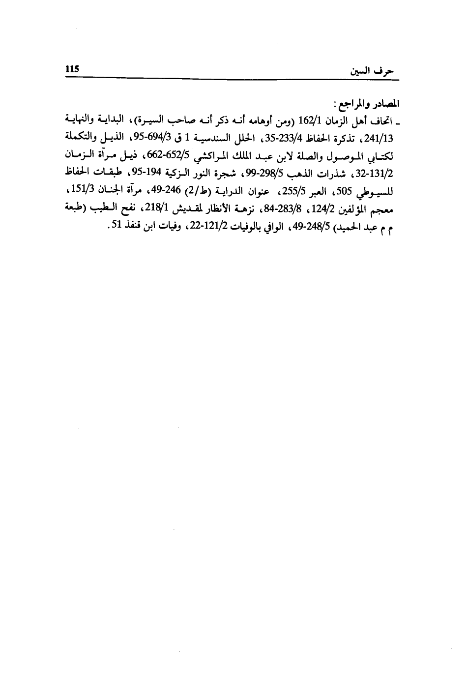 - اتحاف أهل الزمان 1/ 162 (ومن أوهامه أنه ذكر أنه صاحب السيرة)، البداية والنهاية 13/ 241، تذكرة الحفاظ 4/ 233 - 35، الحلل السندسية 1 ق 3/ 694 - 95، الذيل والتكملة لكتابي الموصول والصلة لابن عبد الملك المراكشي 5/ 652 - 662، ذيل مرآة الزمان 2/ 131 - 32، شذرات الذهب 5/ 298 - 99، شجرة النور الزكية 194 - 95، طبقات الحفاظ للسيوطي 505، العبر 5/ 255، عنوان الدراية (ط 2/) 246 - 49، مرآة الجنان 3/ 151، معجم المؤلفين 2/ 124، 8/ 283 - 84، نزهة الأنظار لمقديش 1/ 218، نفح الطيب (طبعة م م عبد الحميد) 5/ 248 - 49، الوافي بالوفيات 2/ 121 - 22، وفيات ابن قنفذ 51.