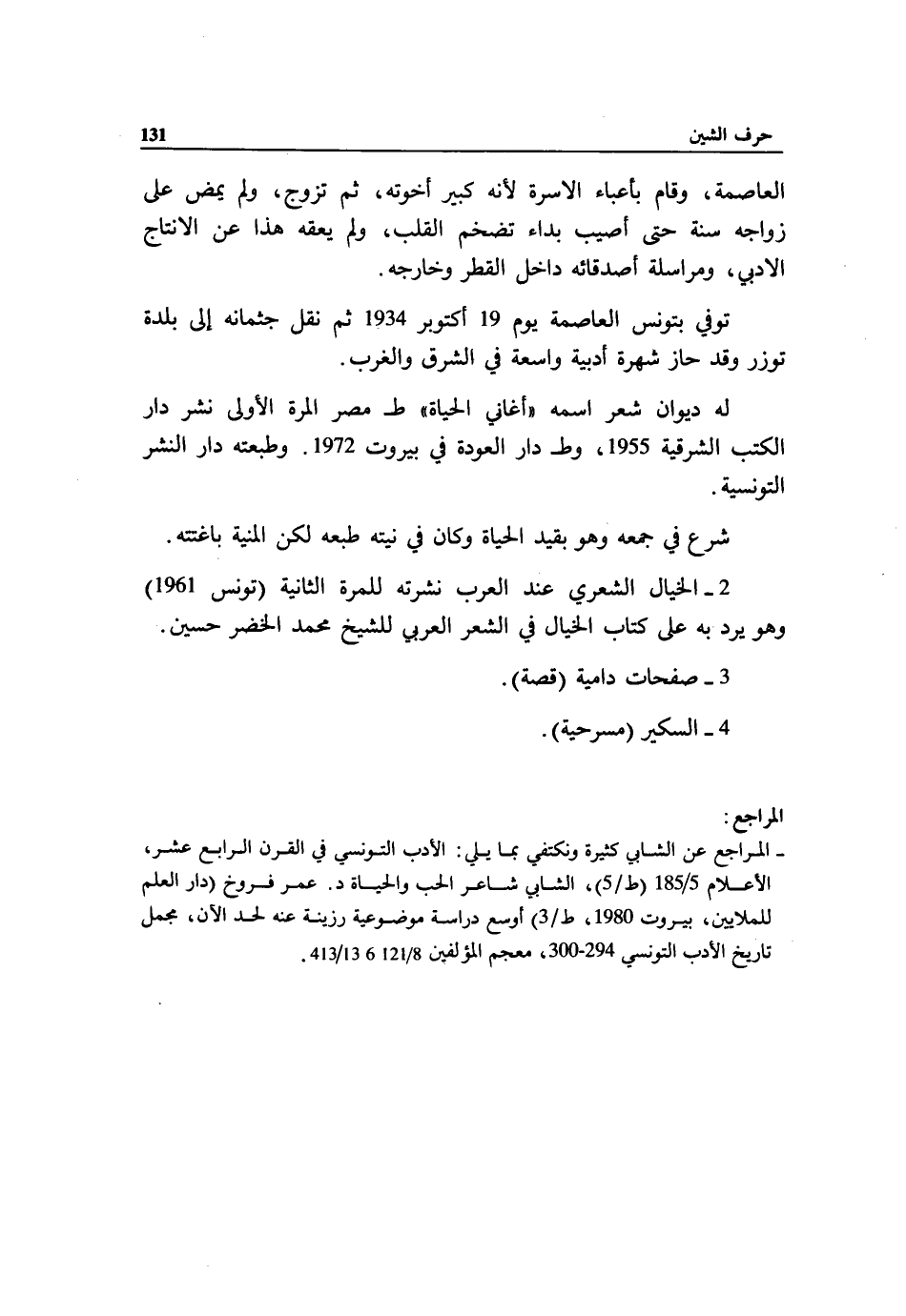 - المراجع عن الشابي كثيرة ونكتفي بما يلي: الأدب التونسي في القرن الرابع عشر، الأعلام 5/ 185 (ط 5/)، الشابي شاعر الحب والحياة د. عمر فروخ (دار العلم للملايين، بيروت 1980، ط 3/) أوسع دراسة موضوعية رزينة عنه لحد الآن، مجمل تاريخ الأدب التونسي 294 - 300، معجم المؤلفين 8/ 121، 6، 13/ 413.