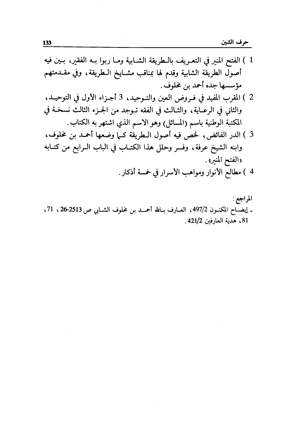 1) الفتح المنير في التعريف بالطريقة الشابية وما ربوا به الفقير، بين فيه أصول الطريقة الشابية وقدم لها بمناقب مشايخ الطريقة، وفي مقدمتهم مؤسسها جده أحمد بن مخلوف.