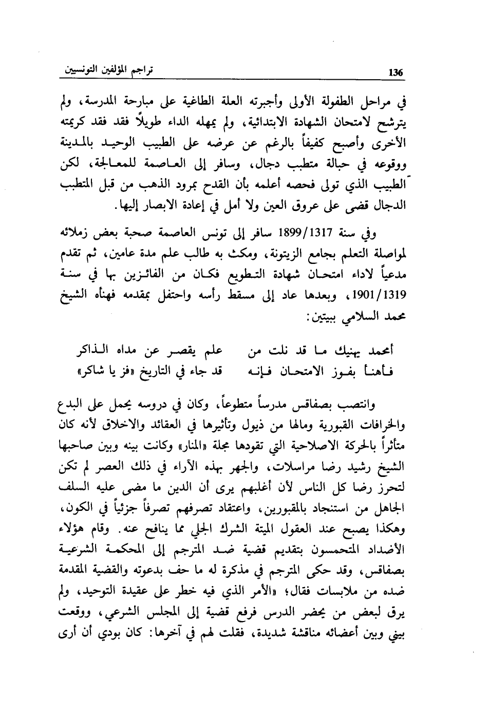 وفي سنة 1317/ 1899 سافر إلى تونس العاصمة صحبة بعض زملائه لمواصلة التعلم بجامع الزيتونة، ومكث به طالب علم مدة عامين، ثم تقدم مدعيا لاداء امتحان شهادة التطويع فكان من الفائزين بها في سنة 1319/ 1901، وبعدها عاد إلى مسقط رأسه واحتفل بمقدمه فهنأه الشيخ محمد السلامي ببيتين:
