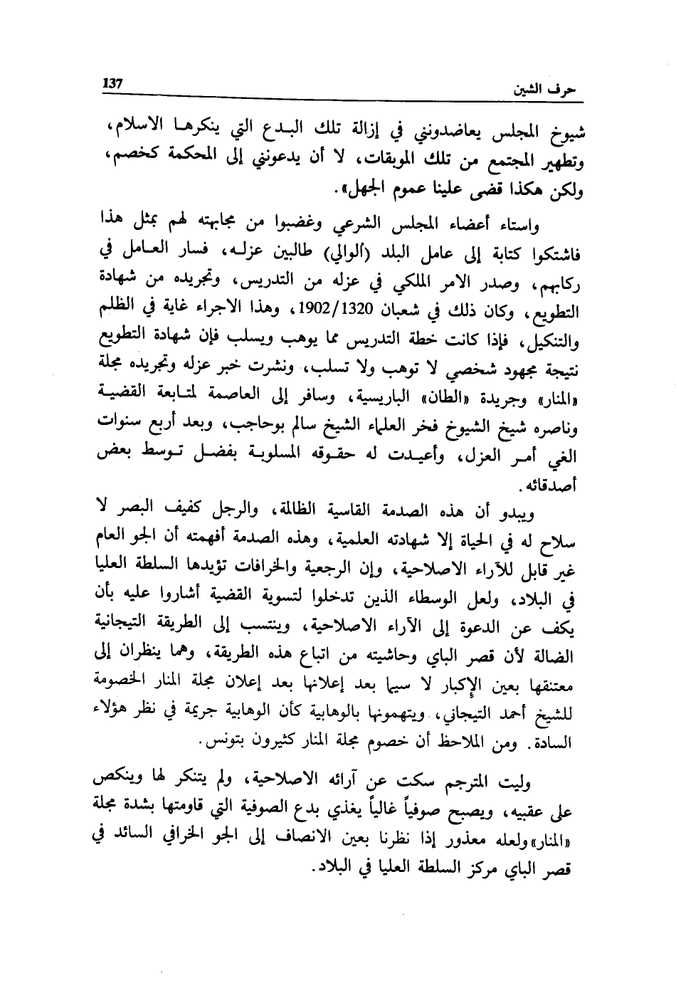 وليت المترجم سكت عن آرائه الاصلاحية، ولم يتنكر لها وينكص على عقبيه، ويصبح صوفيا غاليا يغذي بدع الصوفية التي قاومتها بشدة مجلة «المنار» ولعله معذور إذا نظرنا بعين الانصاف إلى الجو الخرافي السائد في قصر الباي مركز السلطة العليا في البلاد.