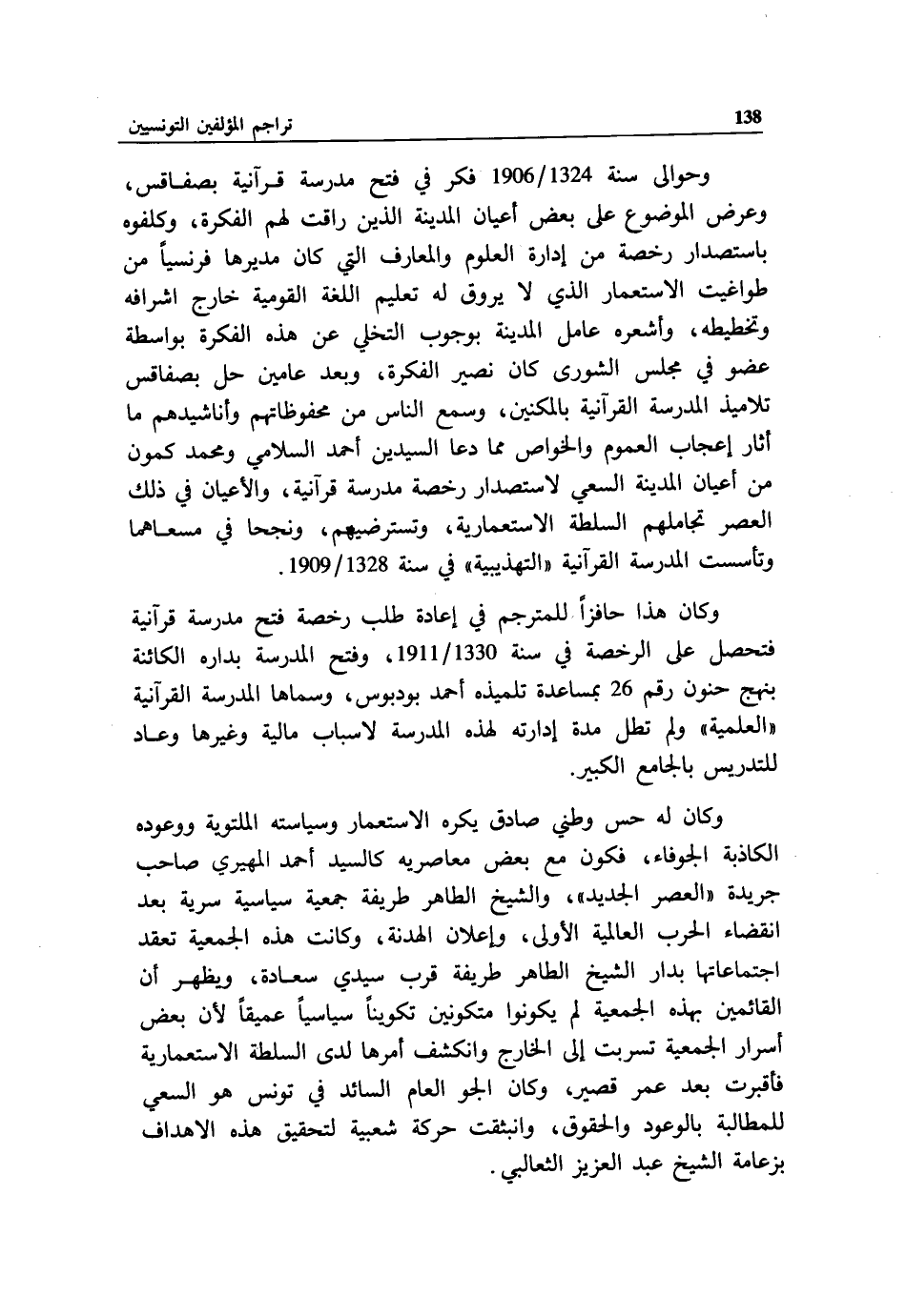 وحوالى سنة 1324/ 1906 فكر في فتح مدرسة قرآنية بصفاقس، وعرض الموضوع على بعض أعيان المدينة الذين راقت لهم الفكرة، وكلفوه باستصدار رخصة من إدارة العلوم والمعارف التي كان مديرها فرنسيا من طواغيت الاستعمار الذي لا يروق له تعليم اللغة القومية خارج اشرافه وتخطيطه، وأشعره عامل المدينة بوجوب التخلي عن هذه الفكرة بواسطة عضو في مجلس الشورى كان نصير الفكرة، وبعد عامين حل بصفاقس تلاميذ المدرسة القرآنية بالمكنين، وسمع الناس من محفوظاتهم وأناشيدهم ما أثار إعجاب العموم والخواص مما دعا السيدين أحمد السلامي ومحمد كمون من أعيان المدينة السعي لاستصدار رخصة مدرسة قرآنية، والأعيان في ذلك العصر تجاملهم السلطة الاستعمارية، وتسترضيهم، ونجحا في مسعاهما وتأسست المدرسة القرآنية «التهذيبية» في سنة 1328/ 1909.