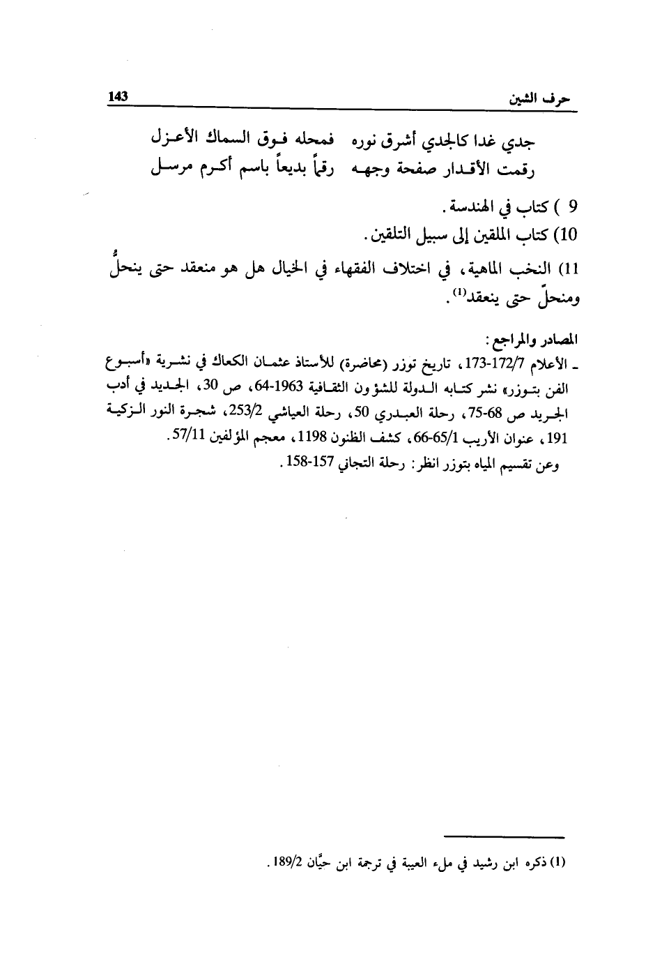 - الأعلام 7/ 172 - 173، تاريخ توزر (محاضرة) للأستاذ عثمان الكعاك في نشرية «أسبوع الفن بتوزر» نشر كتابه الدولة للشئون الثقافية 1963 - 64، ص 30، الجديد في أدب الجريد ص 68 - 75، رحلة العبدري 50، رحلة العياشي 2/ 253، شجرة النور الزكية 191، عنوان الأريب 1/ 65 - 66، كشف الظنون 1198، معجم المؤلفين 11/ 57.