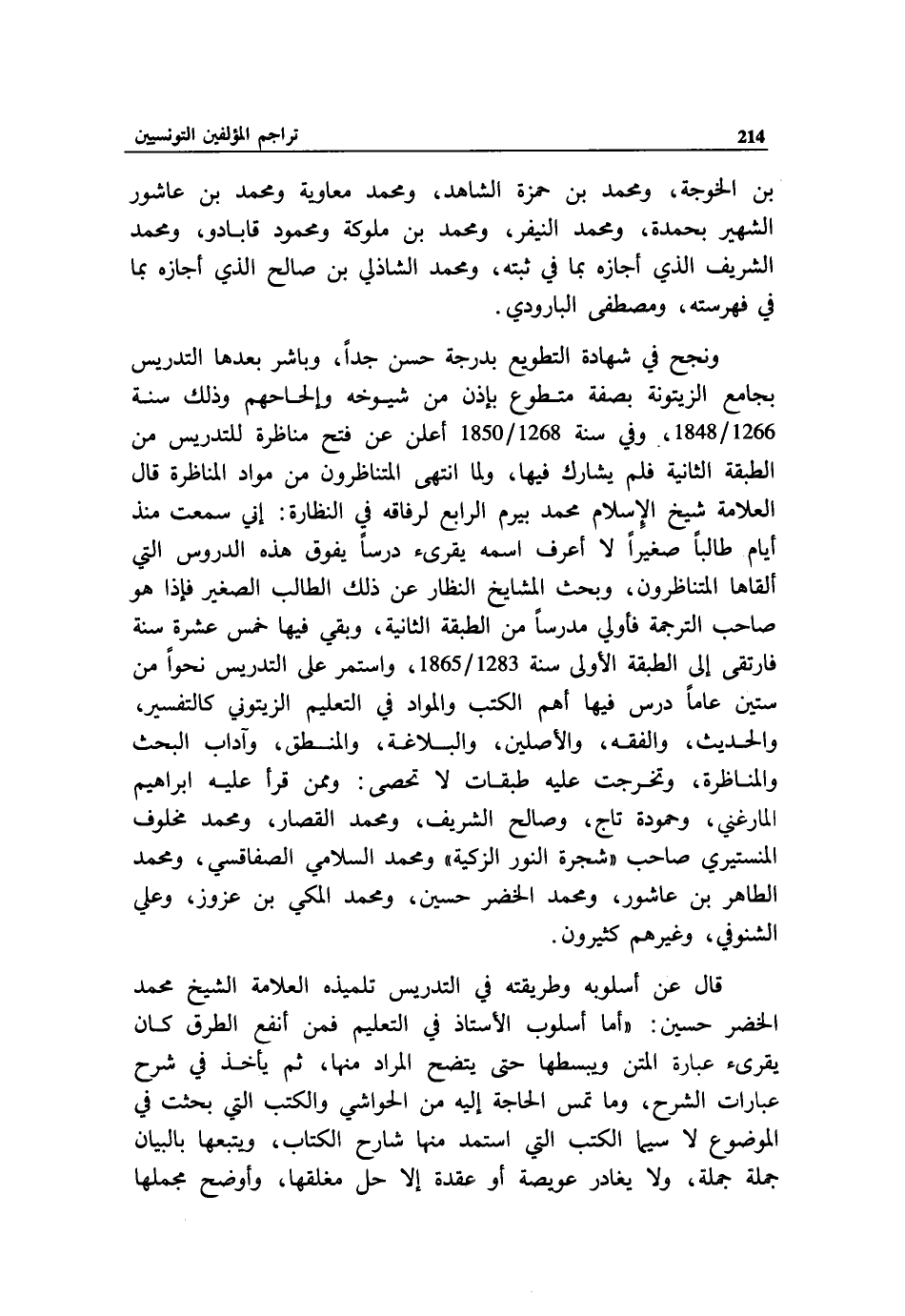 ونجح في شهادة التطويع بدرجة حسن جدا، وباشر بعدها التدريس بجامع الزيتونة بصفة متطوع بإذن من شيوخه وإلحاحهم وذلك سنة 1266/ 1848، وفي سنة 1268/ 1850 أعلن عن فتح مناظرة للتدريس من الطبقة الثانية فلم يشارك فيها، ولما انتهى المتناظرون من مواد المناظرة قال العلامة شيخ الإسلام محمد بيرم الرابع لرفاقه في النظارة: إني سمعت منذ أيام طالبا صغيرا لا أعرف اسمه يقرئ درسا يفوق هذه الدروس التي ألقاها المتناظرون، وبحث المشايخ النظار عن ذلك الطالب الصغير فإذا هو صاحب الترجمة فأولي مدرسا من الطبقة الثانية، وبقي فيها خمس عشرة سنة فارتقى إلى الطبقة الأولى سنة 1283/ 1865، واستمر على التدريس نحوا من ستين عاما درس فيها أهم الكتب والمواد في التعليم الزيتوني كالتفسير، والحديث، والفقه، والأصلين، والبلاغة، والمنطق، وآداب البحث والمناظرة، وتخرجت عليه طبقات لا تحصى: وممن قرأ عليه ابراهيم المارغني، وحمودة تاج، وصالح الشريف، ومحمد القصار، ومحمد مخلوف المنستيري صاحب «شجرة النور الزكية» ومحمد السلامي الصفاقسي، ومحمد الطاهر بن عاشور، ومحمد الخضر حسين، ومحمد المكي بن عزوز، وعلي الشنوفي، وغيرهم كثيرون.
