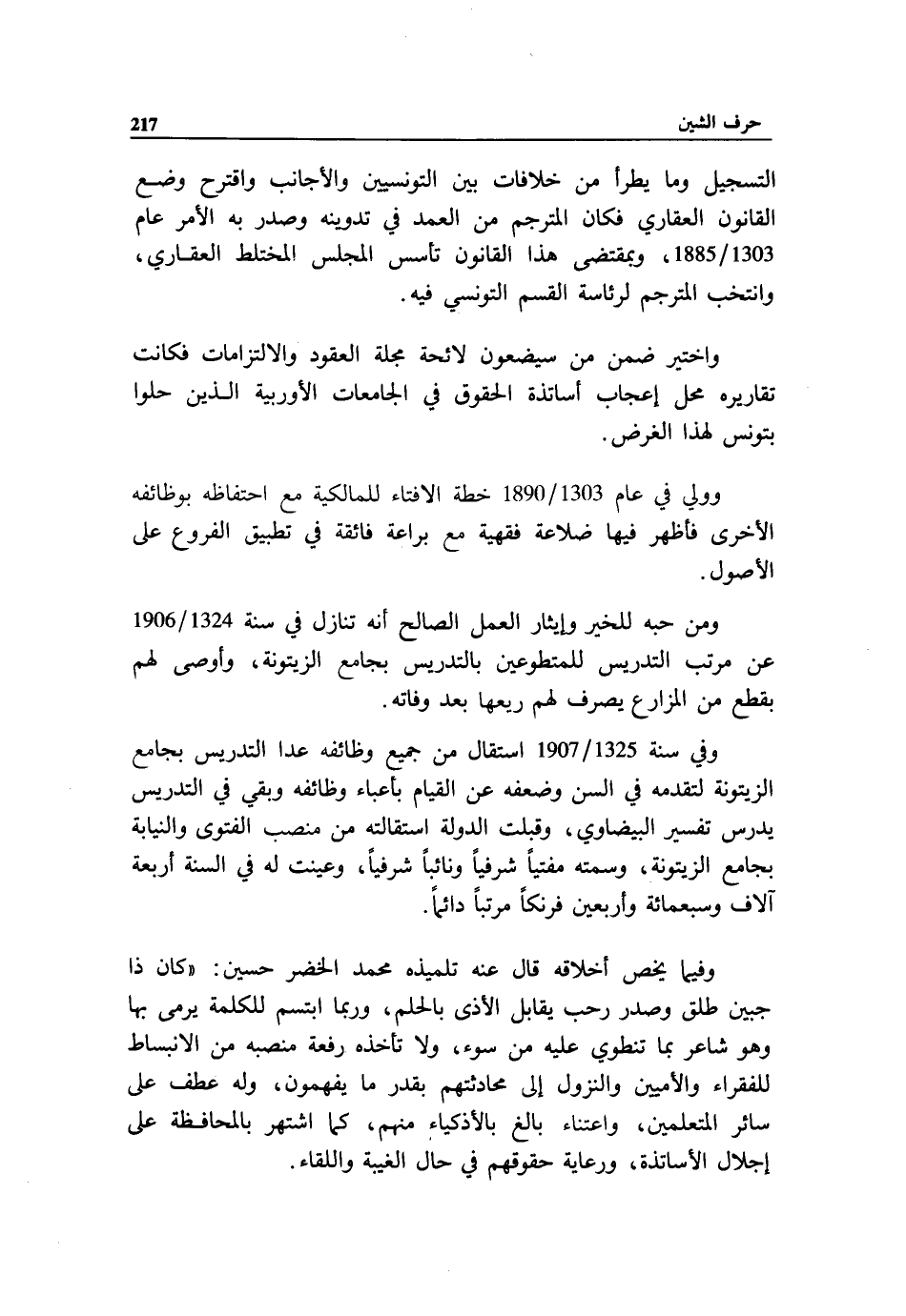 التسجيل وما يطرأ من خلافات بين التونسيين والأجانب واقترح وضع القانون العقاري فكان المترجم من العمد في تدوينه وصدر به الأمر عام 1303/ 1885، وبمقتضى هذا القانون تأسس المجلس المختلط العقاري، وانتخب المترجم لرئاسة القسم التونسي فيه.