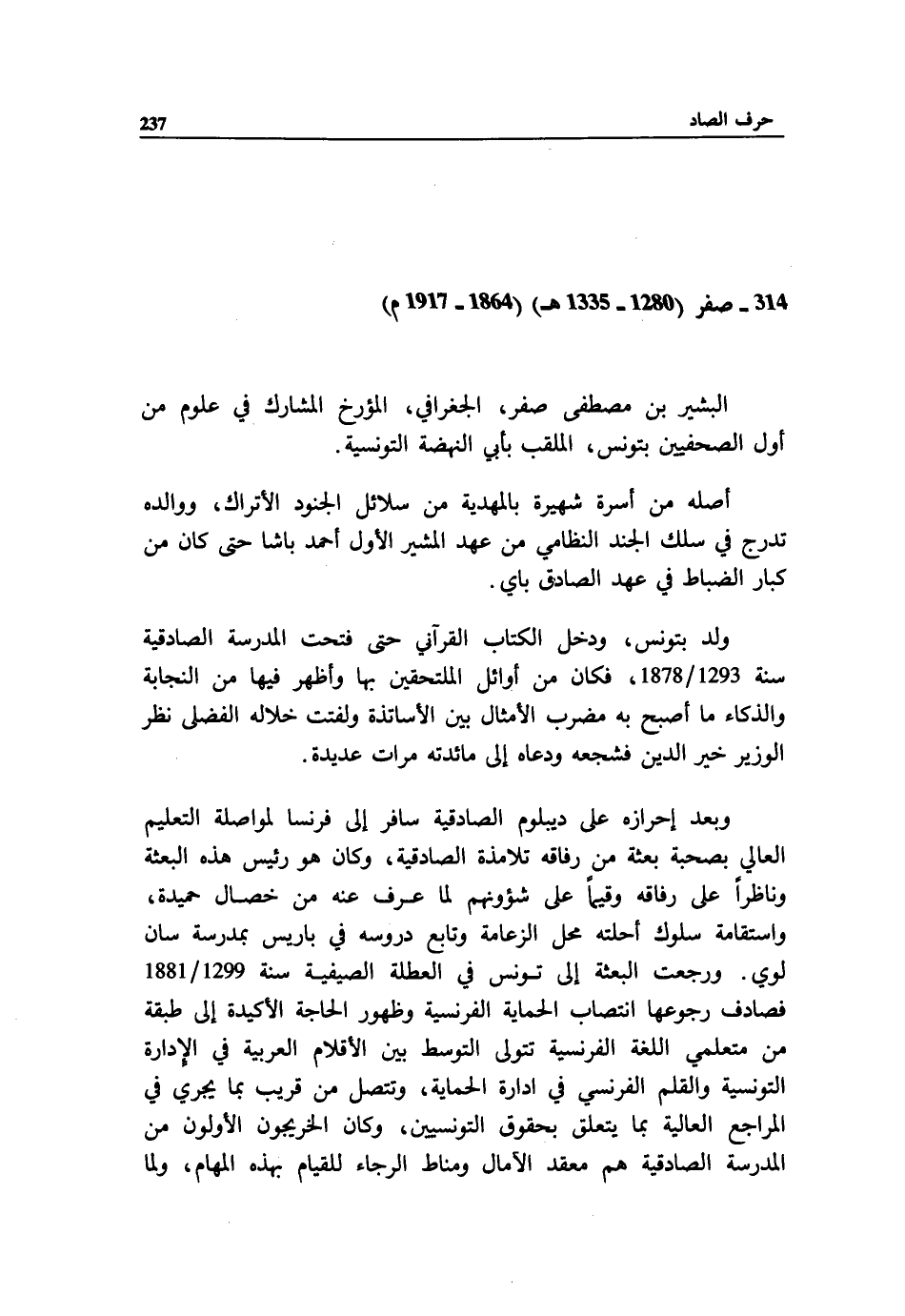 البشير بن مصطفى صفر، الجغرافي، المؤرخ المشارك في علوم من أول الصحفيين بتونس، الملقب بأبي النهضة التونسية.