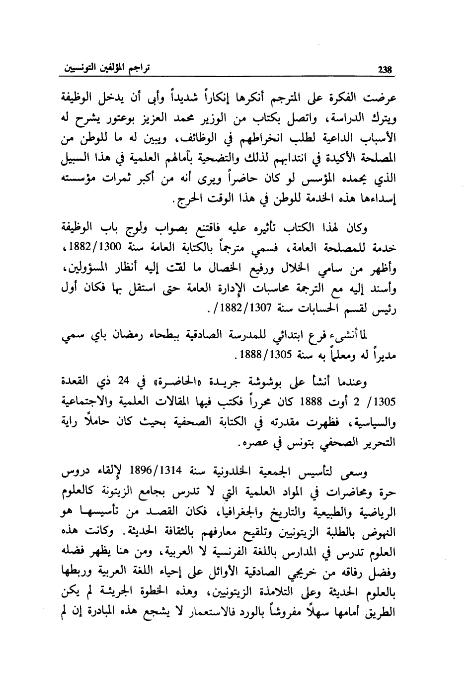 وسعى لتأسيس الجمعية الخلدونية سنة 1314/ 1896 لإلقاء دروس حرة ومحاضرات في المواد العلمية التي لا تدرس بجامع الزيتونة كالعلوم الرياضية والطبيعية والتاريخ والجغرافيا، فكان القصد من تأسيسها هو النهوض بالطلبة الزيتونيين وتلقيح معارفهم بالثقافة الحديثة. وكانت هذه العلوم تدرس في المدارس باللغة الفرنسية لا العربية، ومن هنا يظهر فضله وفضل رفاقه من خريجي الصادقية الأوائل على إحياء اللغة العربية وربطها بالعلوم الحديثة وعلى التلامذة الزيتونيين، وهذه الخطوة الجريئة لم يكن الطريق أمامها سهلا مفروشا بالورد فالاستعمار لا يشجع هذه المبادرة إن لم