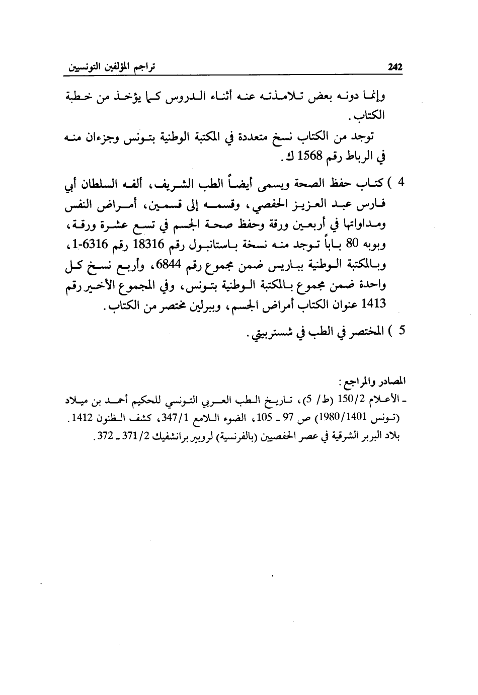 4) كتاب حفظ الصحة ويسمى أيضا الطب الشريف، ألفه السلطان أبي فارس عبد العزيز الحفصي، وقسمه إلى قسمين، أمراض النفس ومداواتها في أربعين ورقة وحفظ صحة الجسم في تسع عشرة ورقة، وبوبه 80 بابا توجد منه نسخة باستانبول رقم 18316 رقم 6316 - 1، وبالمكتبة الوطنية بباريس ضمن مجموع رقم 6844، وأربع نسخ كل واحدة ضمن مجموع بالمكتبة الوطنية بتونس، وفي المجموع الأخير رقم 1413 عنوان الكتاب أمراض الجسم، وببرلين مختصر من الكتاب.