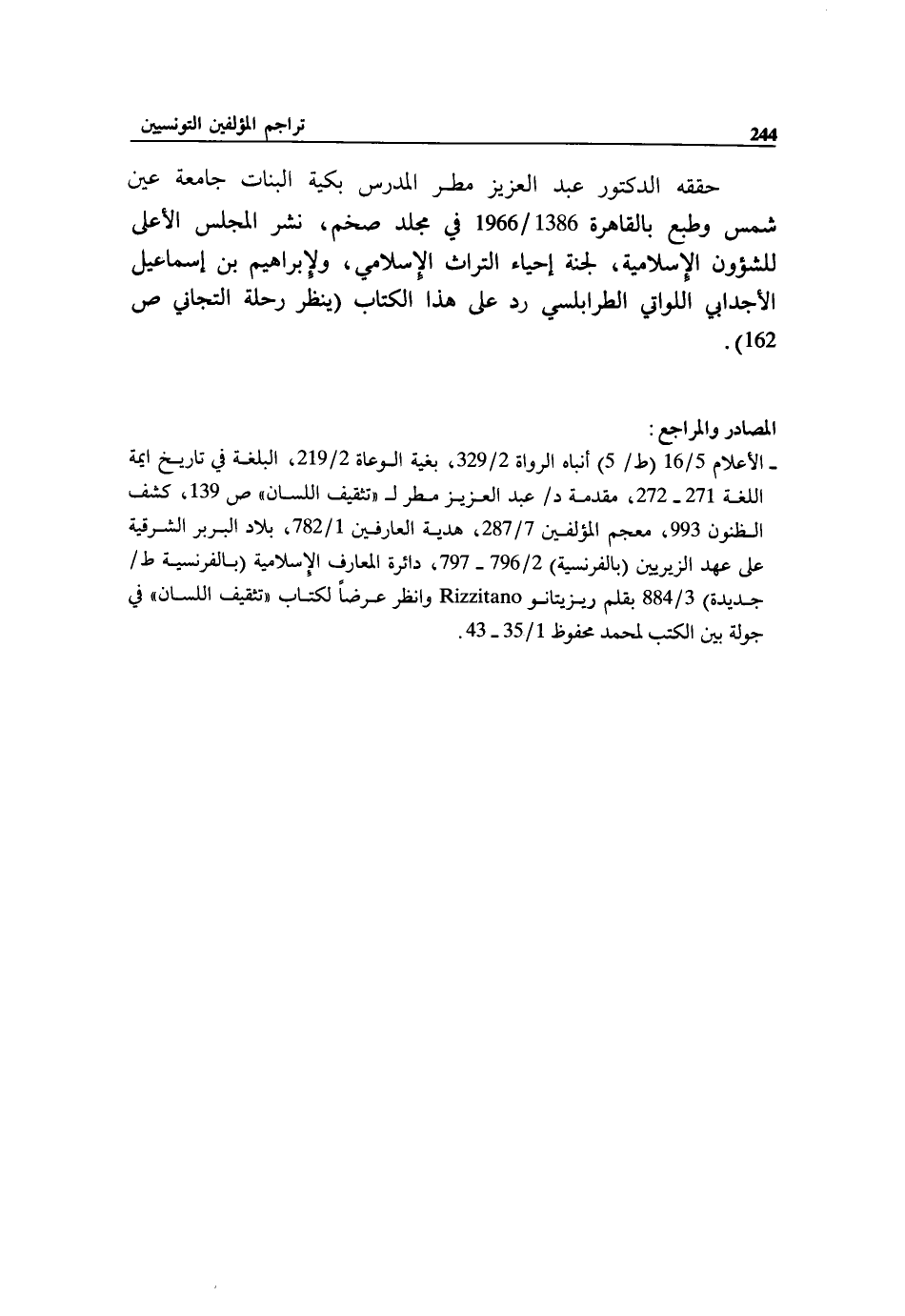 حققه الدكتور عبد العزيز مطر المدرس بكية البنات جامعة عين شمس وطبع بالقاهرة 1386/ 1966 في مجلد صخم، نشر المجلس الأعلى للشئون الإسلامية، لجنة إحياء التراث الإسلامي، ولإبراهيم بن إسماعيل الأجدابي اللواتي الطرابلسي رد على هذا الكتاب (ينظر رحلة التجاني ص 162).