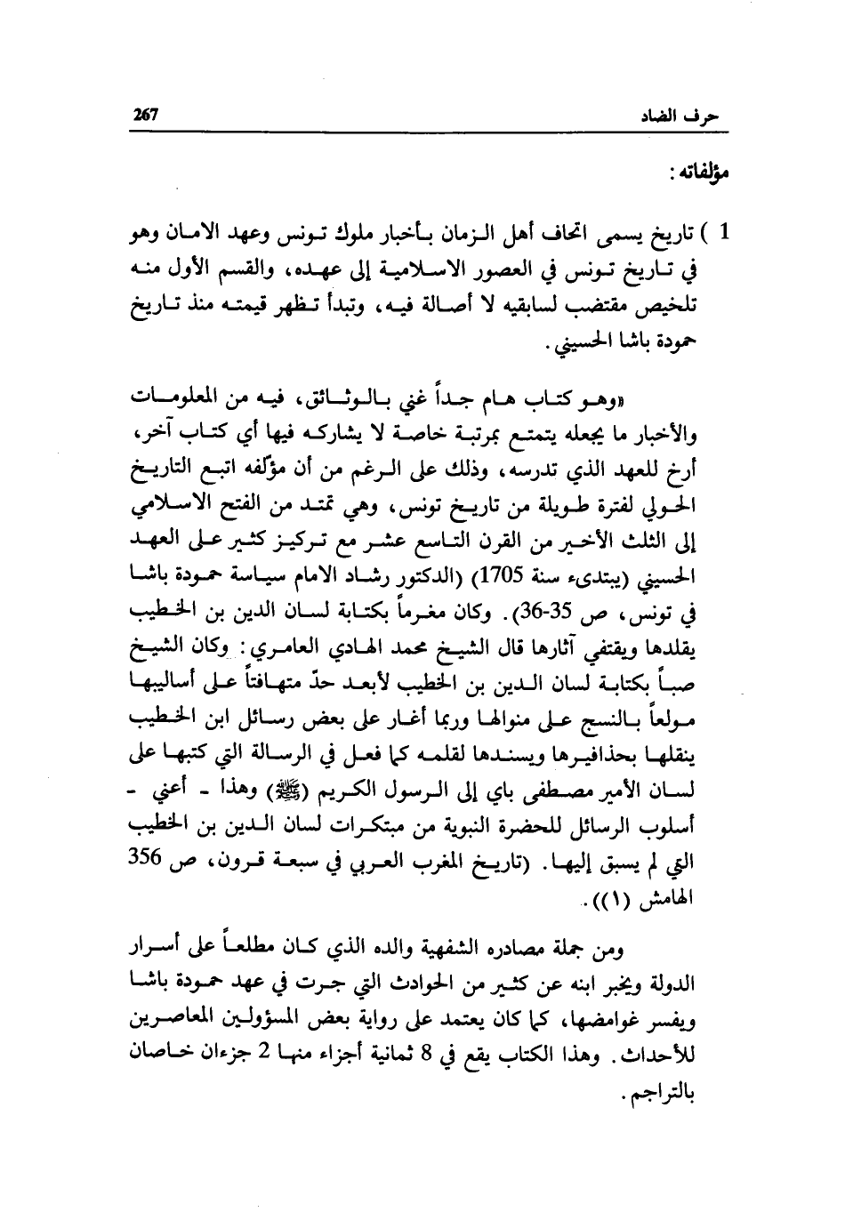 «وهو كتاب هام جدا غني بالوثائق، فيه من المعلومات والأخبار ما يجعله يتمتع بمرتبة خاصة لا يشاركه فيها أي كتاب آخر، أرخ للعهد الذي تدرسه، وذلك على الرغم من أن مؤلّفه اتبع التاريخ الحولي لفترة طويلة من تاريخ تونس، وهي تمتد من الفتح الاسلامي إلى الثلث الأخير من القرن التاسع عشر مع تركيز كثير على العهد الحسيني (يبتدئ سنة 1705) (الدكتور رشاد الامام سياسة حمودة باشا في تونس، ص 35 - 36). وكان مغرما بكتابة لسان الدين بن الخطيب يقلدها ويقتفي آثارها قال الشيخ محمد الهادي العامري: وكان الشيخ صبا بكتابة لسان الدين بن الخطيب لأبعد حدّ متهافتا على أساليبها مولعا بالنسج على منوالها وربما أغار على بعض رسائل ابن الخطيب ينقلها بحذافيرها ويسندها لقلمه كما فعل في الرسالة التي كتبها على لسان الأمير مصطفى باي إلى الرسول الكريم (صلّى الله عليه وسلم) وهذا - أعني - أسلوب الرسائل للحضرة النبوية من مبتكرات لسان الدين بن الخطيب التي لم يسبق إليها. (تاريخ المغرب العربي في سبعة قرون، ص 356 الهامش (1)).