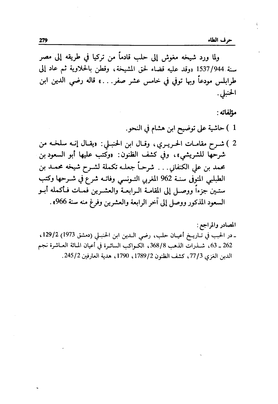 - در الحبب في تاريخ أعيان حلب، رضي الدين ابن الحنبلي (دمشق 1973) 2/ 129، 262 - 63، شذرات الذهب 8/ 368، الكواكب السائرة في أعيان المائة العاشرة نجم الدين الغزي 3/ 77، كشف الظنون 2/ 1789، 1790، هدية العارفين 2/ 245.