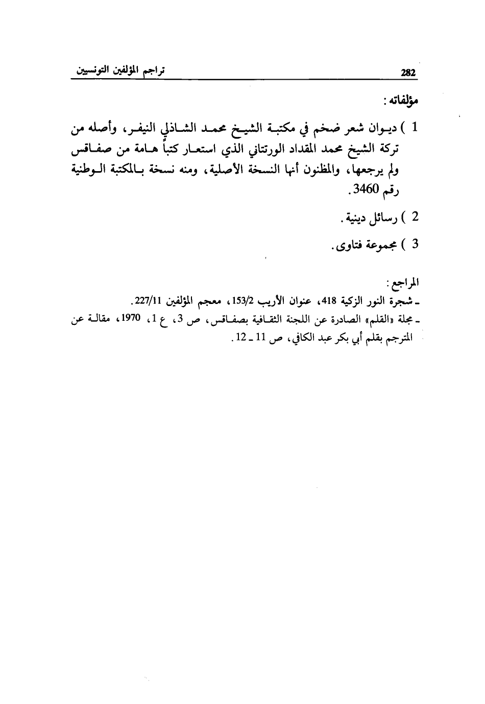 1) ديوان شعر ضخم في مكتبة الشيخ محمد الشاذلي النيفر، وأصله من تركة الشيخ محمد المقداد الورتتاني الذي استعار كتبا هامة من صفاقس ولم يرجعها، والمظنون أنها النسخة الأصلية، ومنه نسخة بالمكتبة الوطنية رقم 3460.