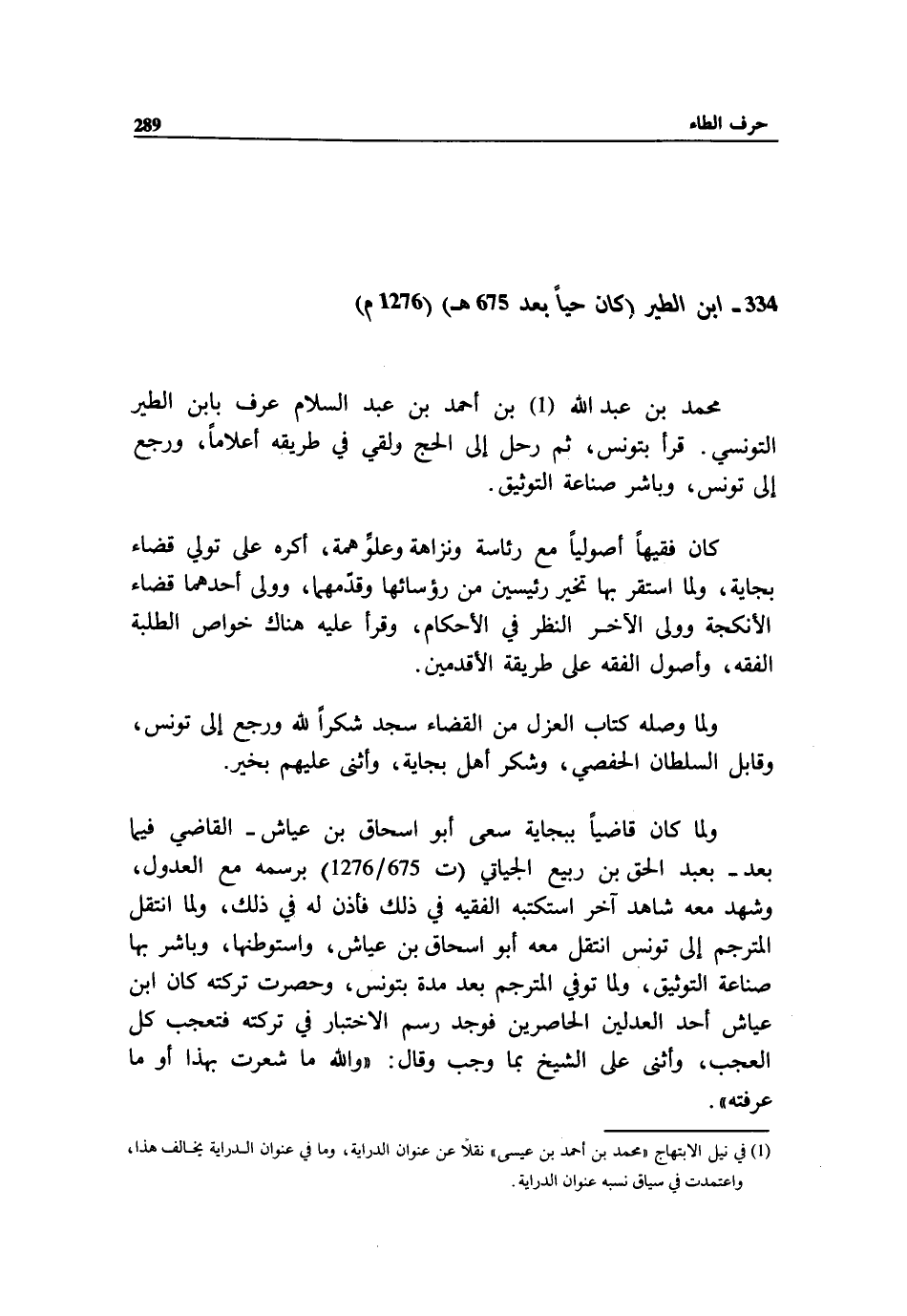 محمد بن عبد الله (¬1) بن أحمد بن عبد السلام عرف بابن الطير التونسي. قرأ بتونس، ثم رحل إلى الحج ولقي في طريقه أعلاما، ورجع إلى تونس، وباشر صناعة التوثيق.