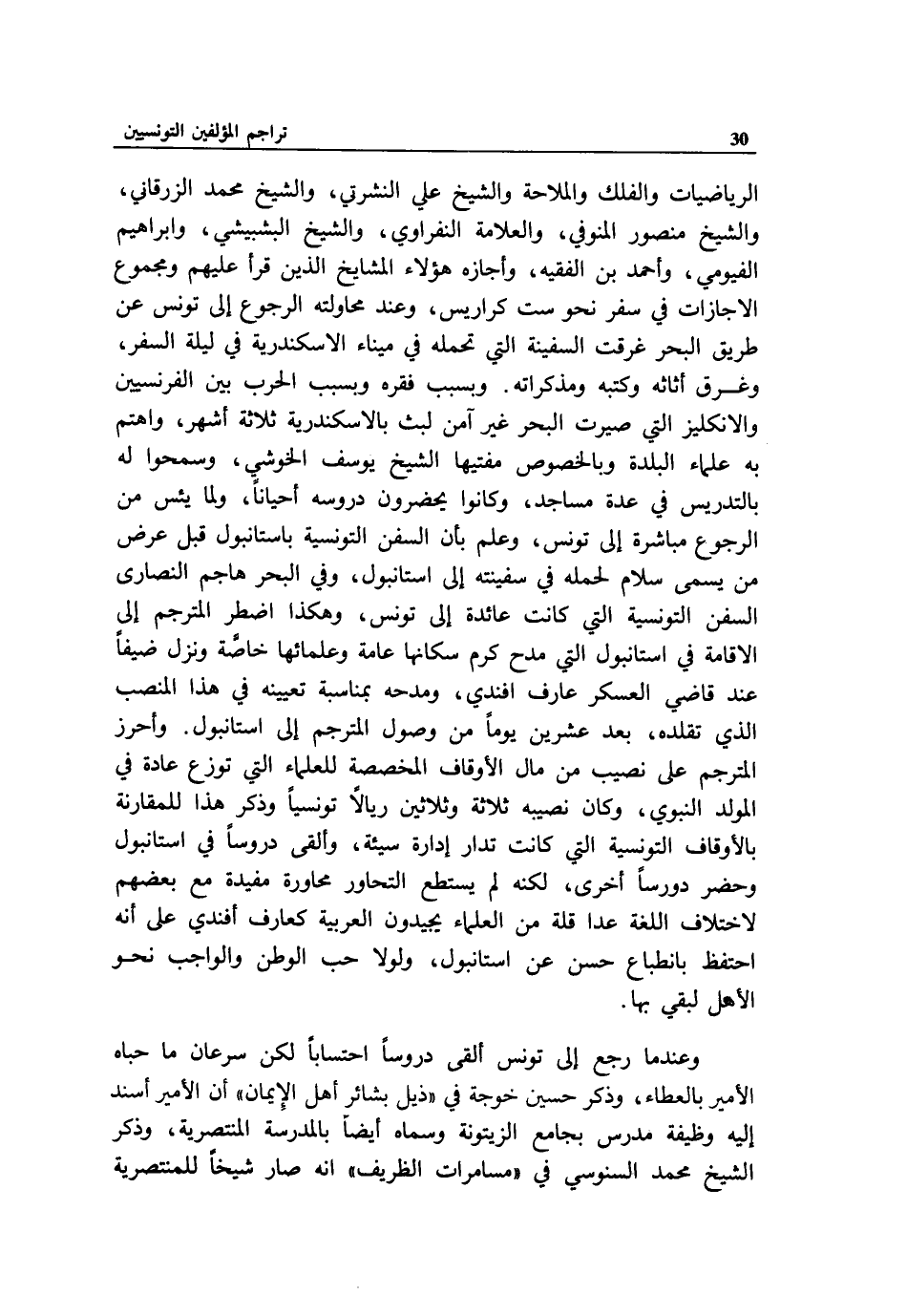 الرياضيات والفلك والملاحة والشيخ علي النشرتي، والشيخ محمد الزرقاني، والشيخ منصور المنوفي، والعلامة النفراوي، والشيخ البشبيشي، وابراهيم الفيومي، وأحمد بن الفقيه، وأجازه هؤلاء المشايخ الذين قرأ عليهم ومجموع الاجازات في سفر نحو ست كراريس، وعند محاولته الرجوع إلى تونس عن طريق البحر غرقت السفينة التي تحمله في ميناء الاسكندرية في ليلة السفر، وغرق أثاثه وكتبه ومذكراته. وبسبب فقره وبسبب الحرب بين الفرنسيين والانكليز التي صيرت البحر غير آمن لبث بالاسكندرية ثلاثة أشهر، واهتم به علماء البلدة وبالخصوص مفتيها الشيخ يوسف الخوشي، وسمحوا له بالتدريس في عدة مساجد، وكانوا يحضرون دروسه أحيانا، ولما يئس من الرجوع مباشرة إلى تونس، وعلم بأن السفن التونسية باستانبول قبل عرض من يسمى سلام لحمله في سفينته إلى استانبول، وفي البحر هاجم النصارى السفن التونسية التي كانت عائدة إلى تونس، وهكذا اضطر المترجم إلى الاقامة في استانبول التي مدح كرم سكانها عامة وعلمائها خاصّة ونزل ضيفا عند قاضي العسكر عارف افندي، ومدحه بمناسبة تعيينه في هذا المنصب الذي تقلده، بعد عشرين يوما من وصول المترجم إلى استانبول. وأحرز المترجم على نصيب من مال الأوقاف المخصصة للعلماء التي توزع عادة في المولد النبوي، وكان نصيبه ثلاثة وثلاثين ريالا تونسيا وذكر هذا للمقارنة بالأوقاف التونسية التي كانت تدار إدارة سيئة، وألقى دروسا في استانبول وحضر دورسا أخرى، لكنه لم يستطع التحاور محاورة مفيدة مع بعضهم لاختلاف اللغة عدا قلة من العلماء يجيدون العربية كعارف أفندي على أنه احتفظ بانطباع حسن عن استانبول، ولولا حب الوطن والواجب نحو الأهل لبقي بها.