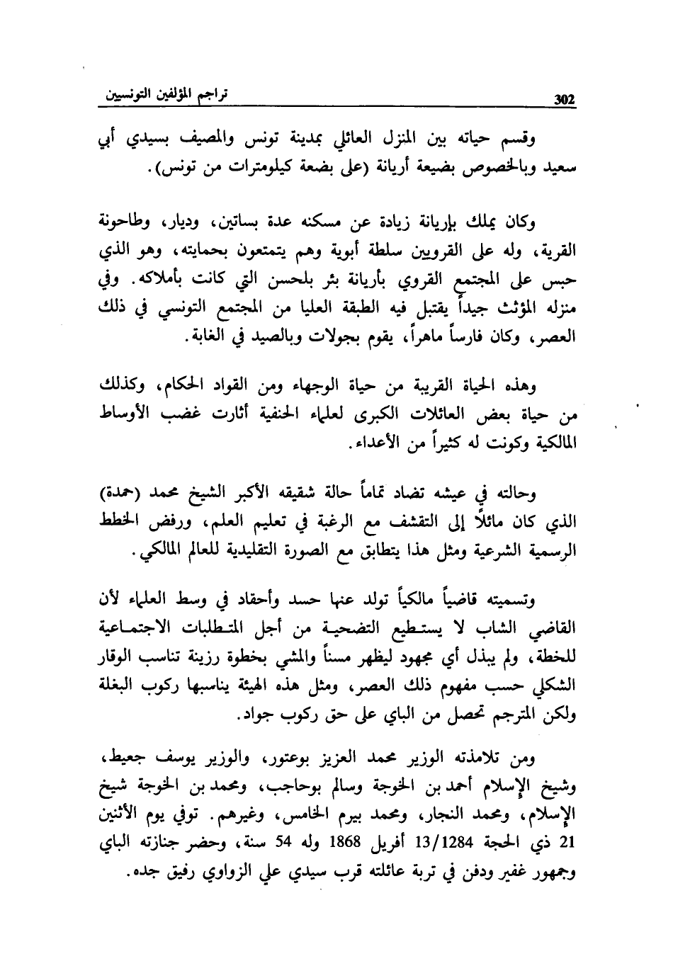 ومن تلامذته الوزير محمد العزيز بوعتور، والوزير يوسف جعيط، وشيخ الإسلام أحمد بن الخوجة وسالم بو حاجب، ومحمد بن الخوجة شيخ الإسلام، ومحمد النجار، ومحمد بيرم الخامس، وغيرهم. توفي يوم الاثنين 21 ذي الحجة 1284/ 13 أفريل 1868 وله 54 سنة، وحضر جنازته الباي وجمهور غفير ودفن في تربة عائلته قرب سيدي علي الزواوي رفيق جده.