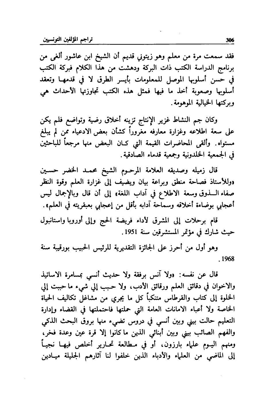 وكان جم النشاط غزير الإنتاج تزينه أخلاق رضية وتواضع فلم يكن على سعة اطلاعه وغزارة معارفه مغرورا كشأن بعض الادعياء ممن لم يبلغ مستواه. وألقى المحاضرات القيمة التي كان البعض منها مرجعا للباحثين في الجمعية الخلدونية وجمعية قدماء الصادقية.