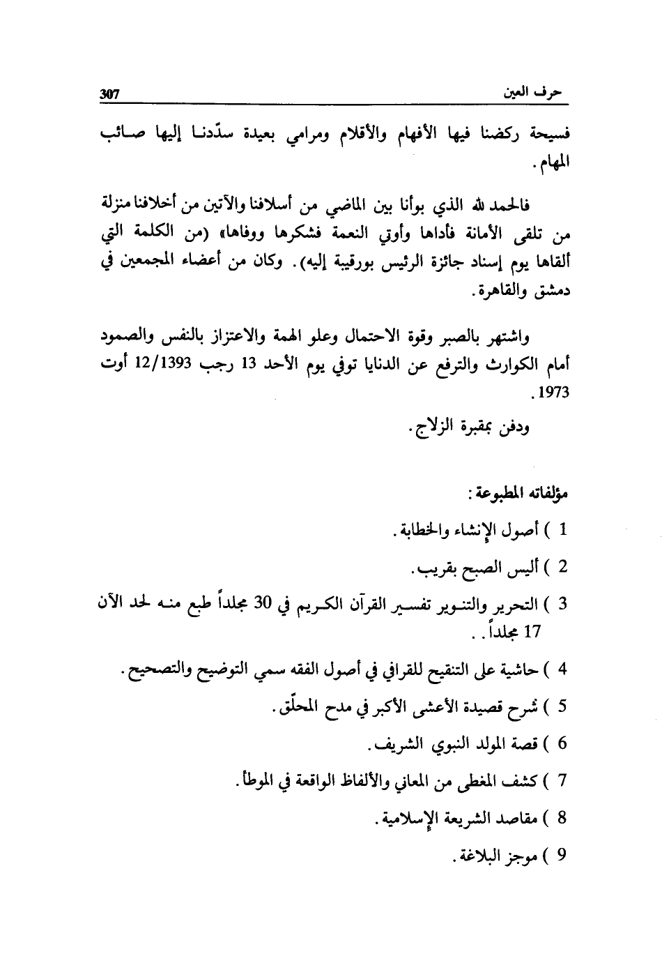 واشتهر بالصبر وقوة الاحتمال وعلو الهمة والاعتزاز بالنفس والصمود أمام الكوارث والترفع عن الدنايا توفي يوم الأحد 13 رجب 1393/ 12 أوت 1973.