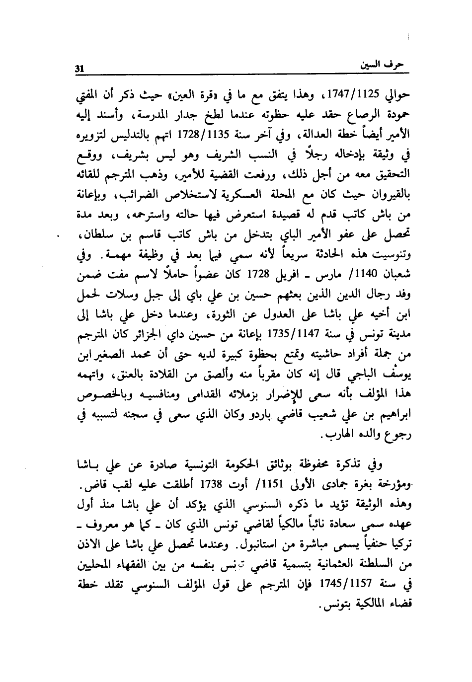 وهذه الوثيقة تؤيد ما ذكره السنوسي الذي يؤكد أن علي باشا منذ أول عهده سمى سعادة نائبا مالكيا لقاضي تونس الذي كان - كما هو معروف - تركيا حنفيا يسمى مباشرة من استانبول. وعند ما تحصل علي باشا على الاذن من السلطنة العثمانية بتسمية قاضي تونس بنفسه من بين الفقهاء المحليين في سنة 1157/ 1745 فإن المترجم على قول المؤلف السنوسي تقلد خطة قضاء المالكية بتونس.