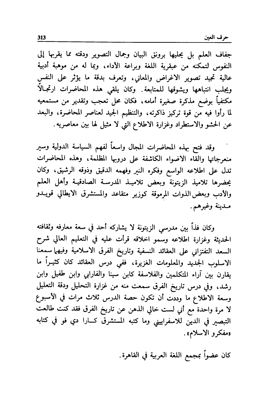 وكان فذا بين مدرسي الزيتونة لا يشاركه أحد في سعة معارفه وثقافته الحديثة وغزارة اطلاعه وسمو اخلاقه قرأت عليه في التعليم العالي شرح السعد التفتازاني على العقائد النسفية وتاريخ الفرق الاسلامية وفيهما سمعنا الاسلوب الجديد والمعلومات الغزيرة، ففي درس العقائد كان كثيرا ما يقارن بين آراء المتكلمين والفلاسفة كابن سينا والفارابي وابن طفيل وابن رشد، وفي درس تاريخ الفرق سمعت منه من غزارة التحليل ودقة التعليل وسعة الاطلاع ما وددت أن تكون حصة الدرس ثلاث مرات في الأسبوع لا مرة واحدة مع أني لست خالي الذهن عن تاريخ الفرق فقد كنت طالعت التبصير في الدين للاسفراييني وما كتبه المستشرق كارا دي فو في كتابه «مفكر والاسلام».