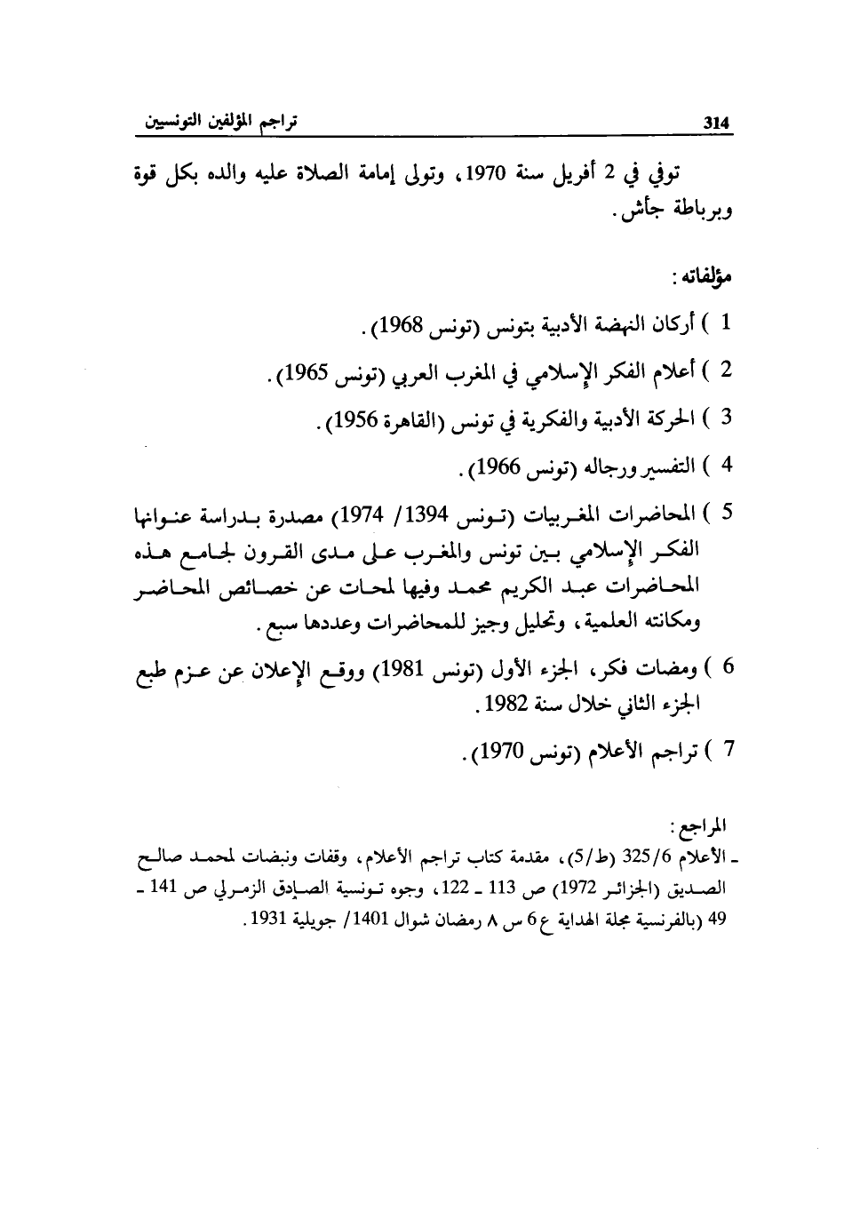 - الأعلام 6/ 325 (ط 5/)، مقدمة كتاب تراجم الأعلام، وقفات ونبضات لمحمد صالح الصديق (الجزائر 1972) ص 113 - 122، وجوه تونسية الصادق الزمرلي ص 141 - 49 (بالفرنسية مجلة الهداية ع 6 س 8 رمضان شوال /1401 جويلية 1931.