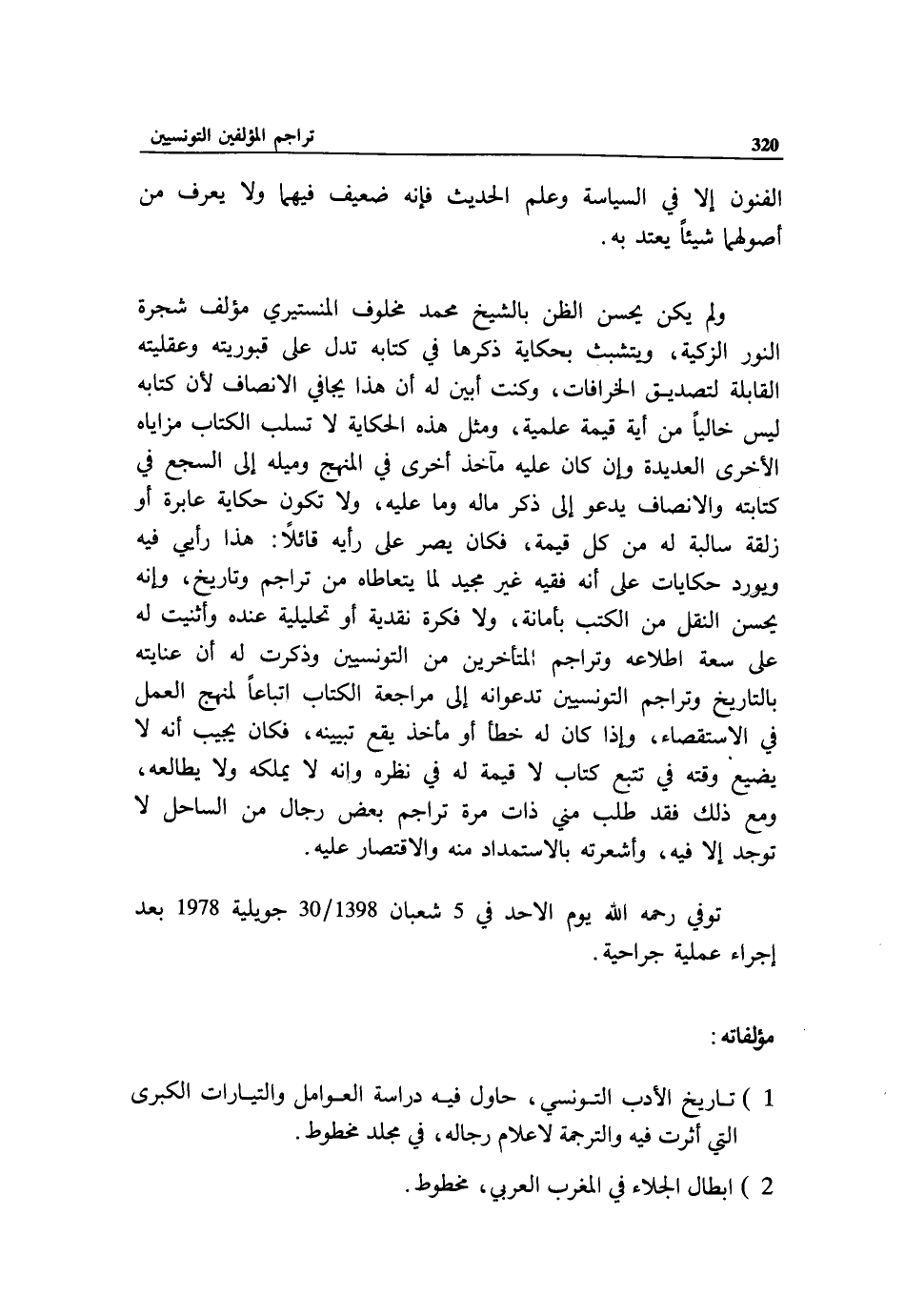 ولم يكن يحسن الظن بالشيخ محمد مخلوف المنستيري مؤلف شجرة النور الزكية، ويتشبث بحكاية ذكرها في كتابه تدل على قبوريته وعقليته القابلة لتصديق الخرافات، وكنت أبين له أن هذا يجافي الانصاف لأن كتابه ليس خاليا من أية قيمة علمية، ومثل هذه الحكاية لا تسلب الكتاب مزاياه الأخرى العديدة وإن كان عليه مآخذ أخرى في المنهج وميله إلى السجع في كتابته والانصاف يدعو إلى ذكر ماله وما عليه، ولا تكون حكاية عابرة أو زلقة سالبة له من كل قيمة، فكان يصر على رأيه قائلا: هذا رأيي فيه ويورد حكايات على أنه فقيه غير مجيد لما يتعاطاه من تراجم وتاريخ، وإنه يحسن النقل من الكتب بأمانة، ولا فكرة نقدية أو تحليلية عنده وأثنيت له على سعة اطلاعه وتراجم المتأخرين من التونسيين وذكرت له أن عنايته بالتاريخ وتراجم التونسيين تدعوانه إلى مراجعة الكتاب اتباعا لمنهج العمل في الاستقصاء، وإذا كان له خطأ أو مأخذ يقع تبيينه، فكان يجيب أنه لا يضيع وقته في تتبع كتاب لا قيمة له في نظره وانه لا يملكه ولا يطالعه، ومع ذلك فقد طلب مني ذات مرة تراجم بعض رجال من الساحل لا توجد إلا فيه، وأشعرته بالاستمداد منه والاقتصار عليه.