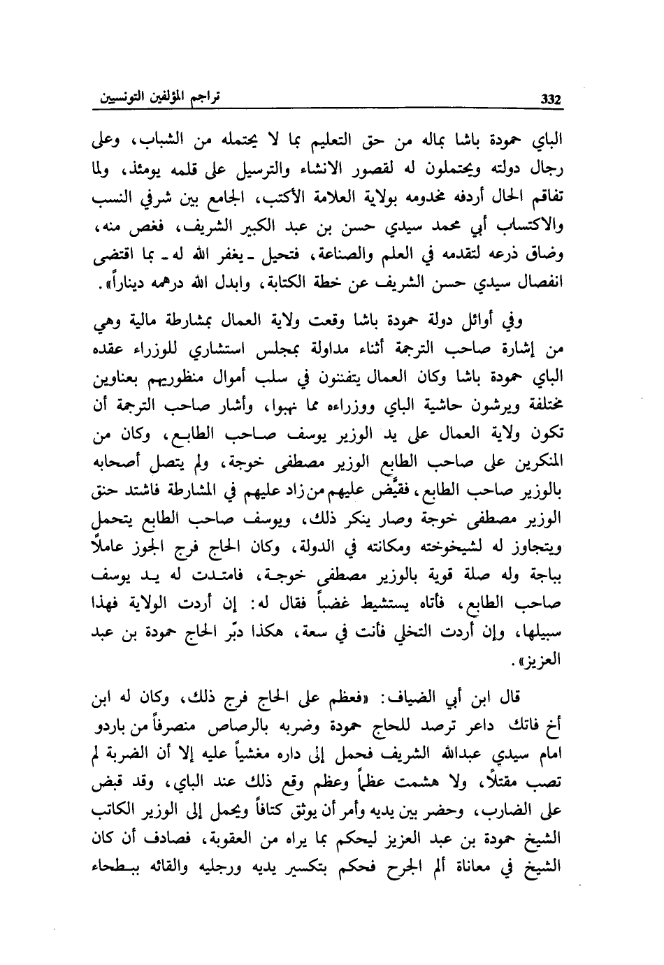الباي حمودة باشا بماله من حق التعليم بما لا يحتمله من الشباب، وعلى رجال دولته ويحتملون له لقصور الانشاء والترسيل على قلمه يومئذ، ولما تفاقم الحال أردفه مخدومه بولاية العلامة الأكتب، الجامع بين شرفي النسب والاكتساب أبي محمد سيدي حسن بن عبد الكبير الشريف، فغص منه، وضاق ذرعه لتقدمه في العلم والصناعة، فتحيل - يغفر الله له - بما اقتضى انفصال سيدي حسن الشريف عن خطة الكتابة، وابدل الله درهمه دينارا».