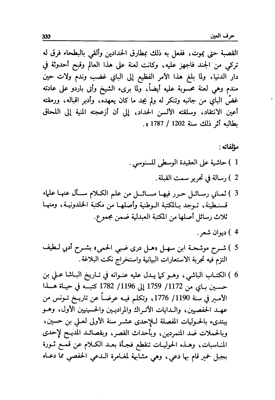 القصبة حتى يموت، ففعل به ذلك بمطارق الحدادين وألقي بالبطحاء فرق له تركي من الجند فاجهز عليه، وكانت لعنة على هذا العالم وقبح أحدوثة في دار الدنيا، ولما بلغ هذا الأمر الفظيع إلى الباي غضب وندم ولات حين مندم وهي لعنة محسوبة عليه أيضا، ولما برئ الشيخ وأتى باردو على عادته غضّ الباي من جانبه وتنكر له ولم يجد ما كان يعهده، وأدبر اقباله، ورمقته أعين الانتقاد، وسلقته الألسن الحداد، إلى أن أزعجته المنية إلى اللحاق بطالبه أثر ذلك سنة 1202/ 1787».