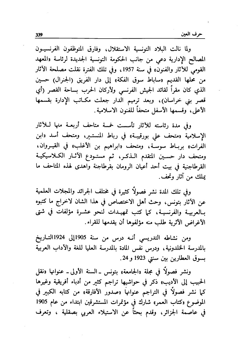 ولما نالت البلاد التونسية الاستقلال، وفارق المتوظفون الفرنسيون المصالح الإدارية دعي من جانب الحكومة التونسية الجديدة لرئاسة «المعهد القومي للآثار والفنون» في سنة 1957، وفي تلك الفترة نقلت مصلحة الآثار من محلها القديم «ساباط سوق الفكة» إلى دار الفريق (الجنرال) حسين الذي كان مقرا لقائد الجيش الفرنسي ولأركان الحرب بساحة القصر (أي قصر بني خراسان)، وبعد ترميم الدار جعلت مكاتب الإدارة بقسمها الأعلى، وقسمها الأسفل متحفا للفنون الاسلامية.