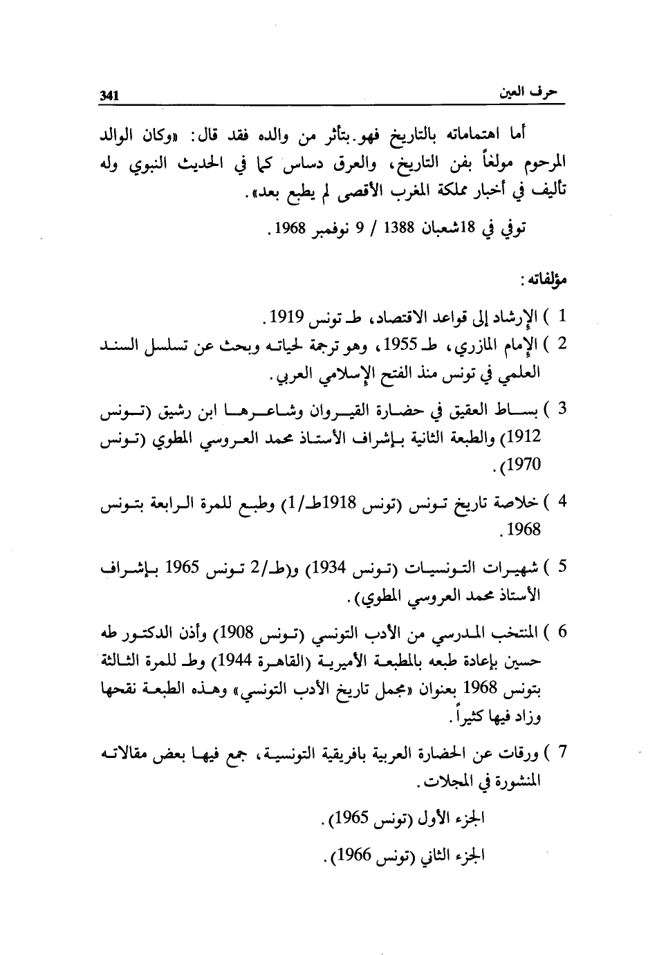 5) شهيرات التونسيات (تونس 1934) و (ط 2/ تونس 1965 بإشراف الأستاذ محمد العروسي المطوي).