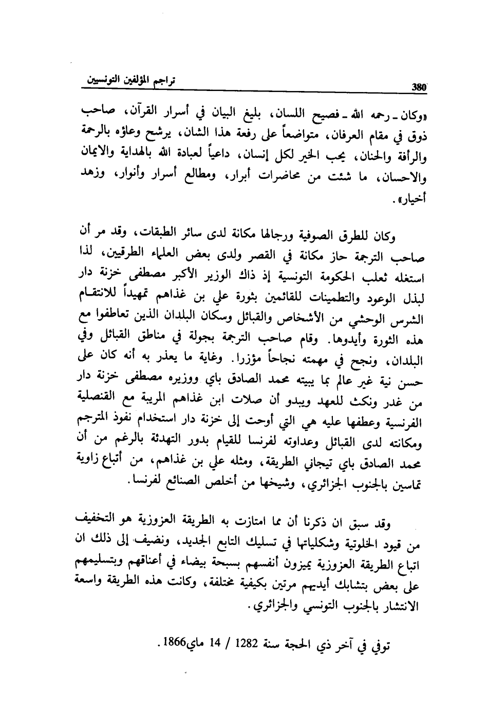 توفي في آخر ذي الحجة سنة 1282/ 14 ماي 1866.