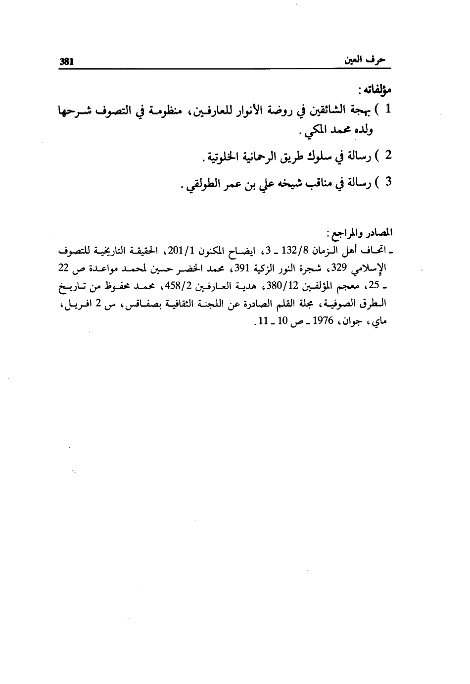 - اتحاف أهل الزمان 8/ 132 - 3، ايضاح المكنون 1/ 201، الحقيقة التاريخية للتصوف الإسلامي 329، شجرة النور الزكية 391، محمد الخضر حسين لمحمد مواعدة ص 22 - 25، معجم المؤلفين 12/ 380، هدية العارفين 2/ 458، محمد محفوظ من تاريخ الطرق الصوفية، مجلة القلم الصادرة عن اللجنة الثقافية بصفاقس، س 2 افريل، ماي، جوان، 1976 - ص 10 - 11.