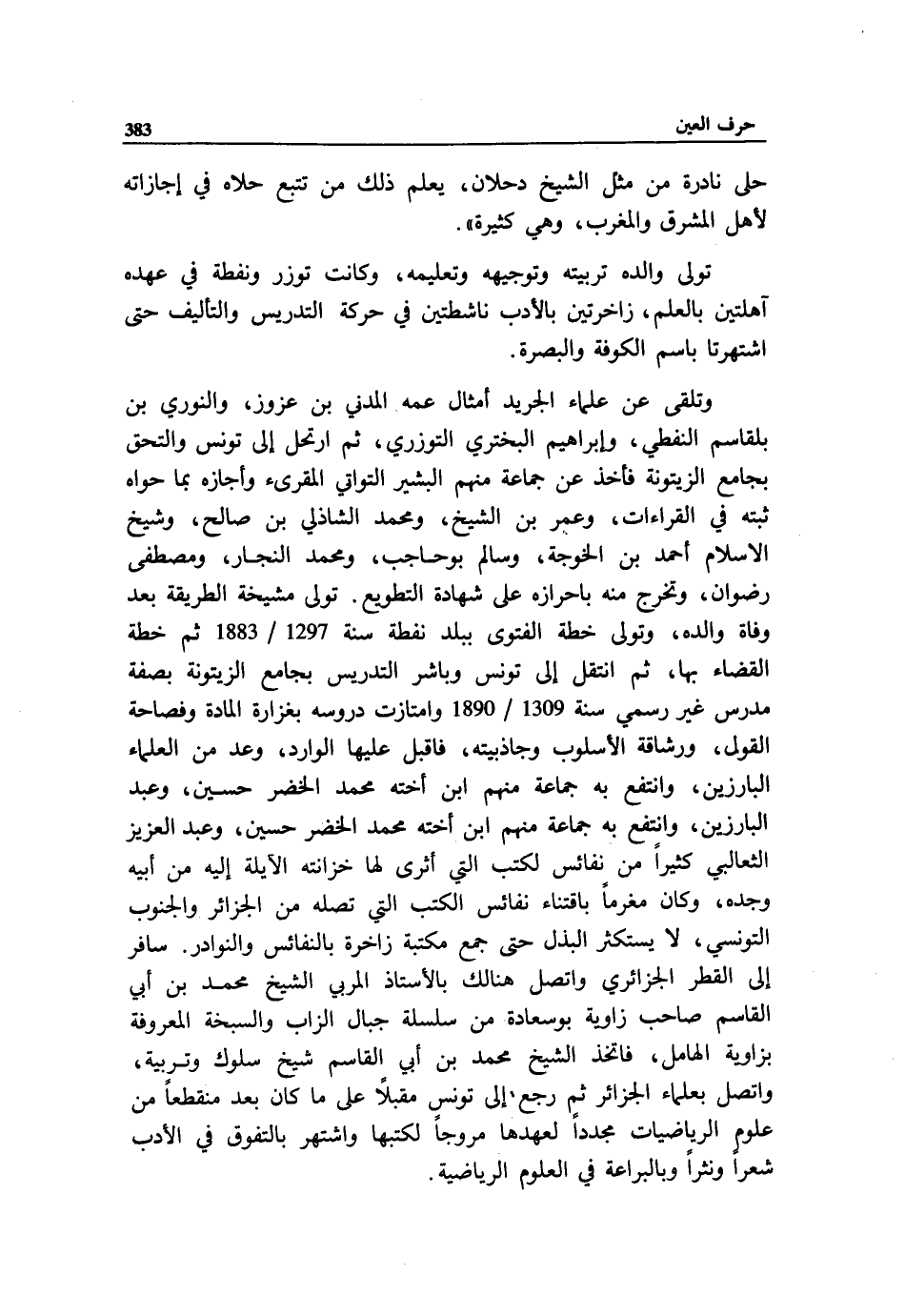 وتلقى عن علماء الجريد أمثال عمه المدني بن عزوز، والنوري بن بلقاسم النفطي، وإبراهيم البختري التوزري، ثم ارتحل إلى تونس والتحق بجامع الزيتونة فأخذ عن جماعة منهم البشير التواتي المقرئ وأجازه بما حواه ثبته في القراءات، وعمر بن الشيخ، ومحمد الشاذلي بن صالح، وشيخ الاسلام أحمد بن الخوجة، وسالم بو حاجب، ومحمد النجار، ومصطفى رضوان، وتخرج منه باحرازه على شهادة التطويع. تولى مشيخة الطريقة بعد وفاة والده، وتولى خطة الفتوى ببلد نفطة سنة 1297/ 1883 ثم خطة القضاء بها، ثم انتقل إلى تونس وباشر التدريس بجامع الزيتونة بصفة مدرس غير رسمي سنة 1309/ 1890 وامتازت دروسه بغزارة المادة وفصاحة القول، ورشاقة الأسلوب وجاذبيته، فاقبل عليها الوارد، وعد من العلماء البارزين، وانتفع به جماعة منهم ابن أخته محمد الخضر حسين، وعبد البارزين، وانتفع به جماعة منهم ابن أخته محمد الخضر حسين، وعبد العزيز الثعالبي كثيرا من نفائس لكتب التي أثرى لها خزانته الآيلة إليه من أبيه وجده، وكان مغرما باقتناء نفائس الكتب التي تصله من الجزائر والجنوب التونسي، لا يستكثر البذل حتى جمع مكتبة زاخرة بالنفائس والنوادر. سافر إلى القطر الجزائري واتصل هنالك بالأستاذ المربي الشيخ محمد بن أبي القاسم صاحب زاوية بو سعادة من سلسلة جبال الزاب والسبخة المعروفة بزاوية الهامل، فاتخذ الشيخ محمد بن أبي القاسم شيخ سلوك وتربية، واتصل بعلماء الجزائر ثم رجع إلى تونس مقبلا على ما كان بعد منقطعا من علوم الرياضيات مجددا لعهدها مروجا لكتبها واشتهر بالتفوق في الأدب شعرا ونثرا وبالبراعة في العلوم الرياضية.
