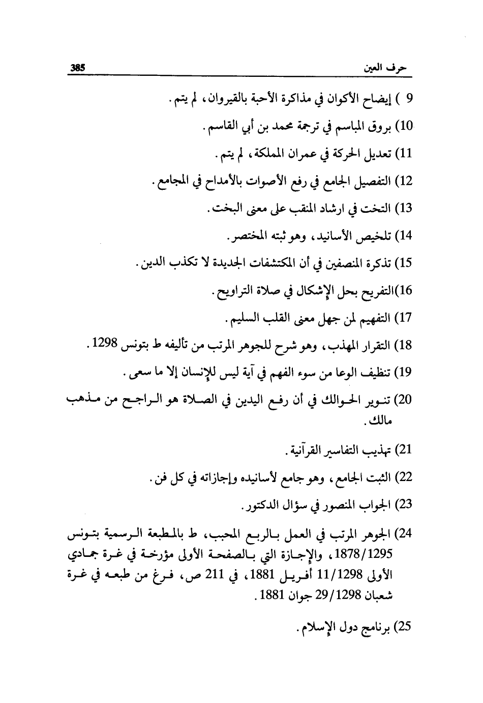 24) الجوهر المرتب في العمل بالربع المحبب، ط بالمطبعة الرسمية بتونس 1295/ 1878، والإجازة التي بالصفحة الأولى مؤرخة في غرة جمادي الأولى 1298/ 11 أفريل 1881، في 211 ص، فرغ من طبعه في غرة شعبان 1298/ 29 جوان 1881.