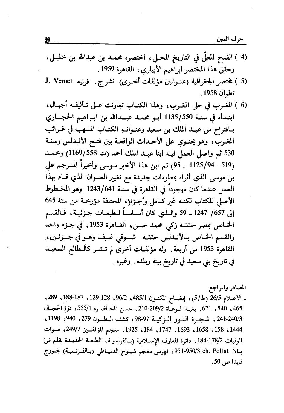 (6) المغرب في حلى المغرب، وهذا الكتاب تعاونت على تأليفه أجيال، ابتدأه في سنة 550/ 1135 أبو محمد عبد الله بن ابراهيم الحجاري باقتراح من عبد الملك بن سعيد وعنوانه الكتاب المسهب في غرائب المغرب، وهو يحتوي على الأحداث الواقعة بين فتح الأندلس وسنة 530 ثم واصل العمل فيه ابنا عبد الملك أحمد (ت 558/ 1169) ومحمد (519 - 94/ 1125 - 95) ثم ابن هذا الأخير موسى وأخيرا المترجم علي بن موسى الذي أثراه بمعلومات جديدة مع تغيير العنوان الذي قام بهذا العمل عند ما كان موجودا في القاهرة في سنة 641/ 1243 وهو المخطوط الأصلي للكتاب لكنه غير كامل وأجزاؤه المختلفة مؤرخة من سنة 645 إلى 657/ 1247 - 59 والذي كان أساسا لطبعات جزئية، فالقسم الخاص بمصر حققه زكي محمد حسن، القاهرة 1953، في جزء واحد والقسم الخاص بالأندلس حققه شوقي ضيف وهو في جزءين، القاهرة 1953 من أربعة. وله مؤلفات أخرى لم تنشر كالطالع السعيد في تاريخ بني سعيد في تاريخ بيته وبلده. وغيره.