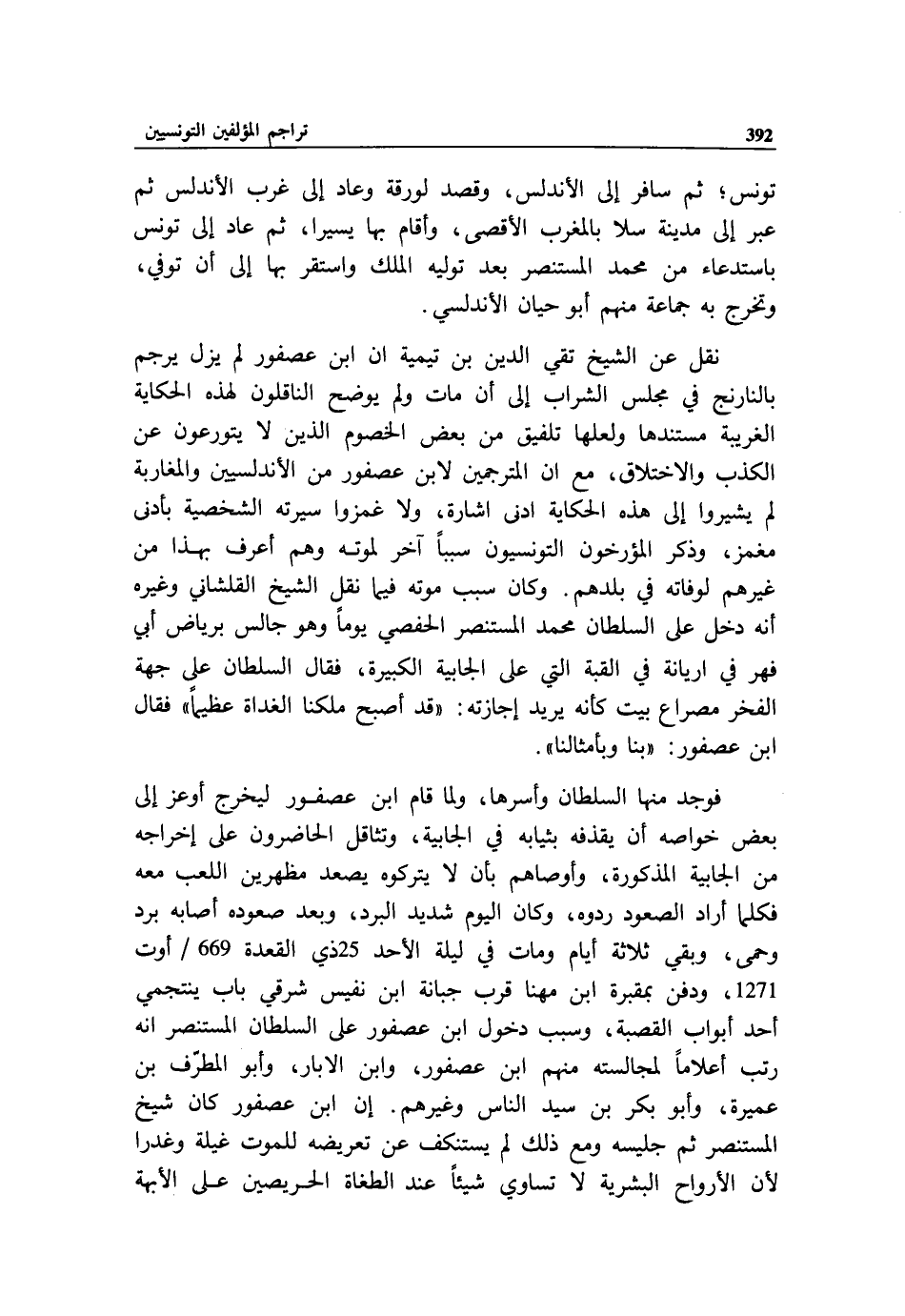 فوجد منها السلطان وأسرها، ولما قام ابن عصفور ليخرج أوعز إلى بعض خواصه أن يقذفه بثيابه في الجابية، وتثاقل الحاضرون على إخراجه من الجابية المذكورة، وأوصاهم بأن لا يتركوه يصعد مظهرين اللعب معه فكلما أراد الصعود ردوه، وكان اليوم شديد البرد، وبعد صعوده أصابه برد وحمى، وبقي ثلاثة أيام ومات في ليلة الأحد 25 ذي القعدة /669 أوت 1271، ودفن بمقبرة ابن مهنا قرب جبانة ابن نفيس شرقي باب ينتجمي أحد أبواب القصبة، وسبب دخول ابن عصفور على السلطان المستنصر انه رتب أعلاما لمجالسته منهم ابن عصفور، وابن الابار، وأبو المطرّف بن عميرة، وأبو بكر بن سيد الناس وغيرهم. إن ابن عصفور كان شيخ المستنصر ثم جليسه ومع ذلك لم يستنكف عن تعريضه للموت غيلة وغدرا لأن الأرواح البشرية لا تساوي شيئا عند الطغاة الحريصين على الأبهة
