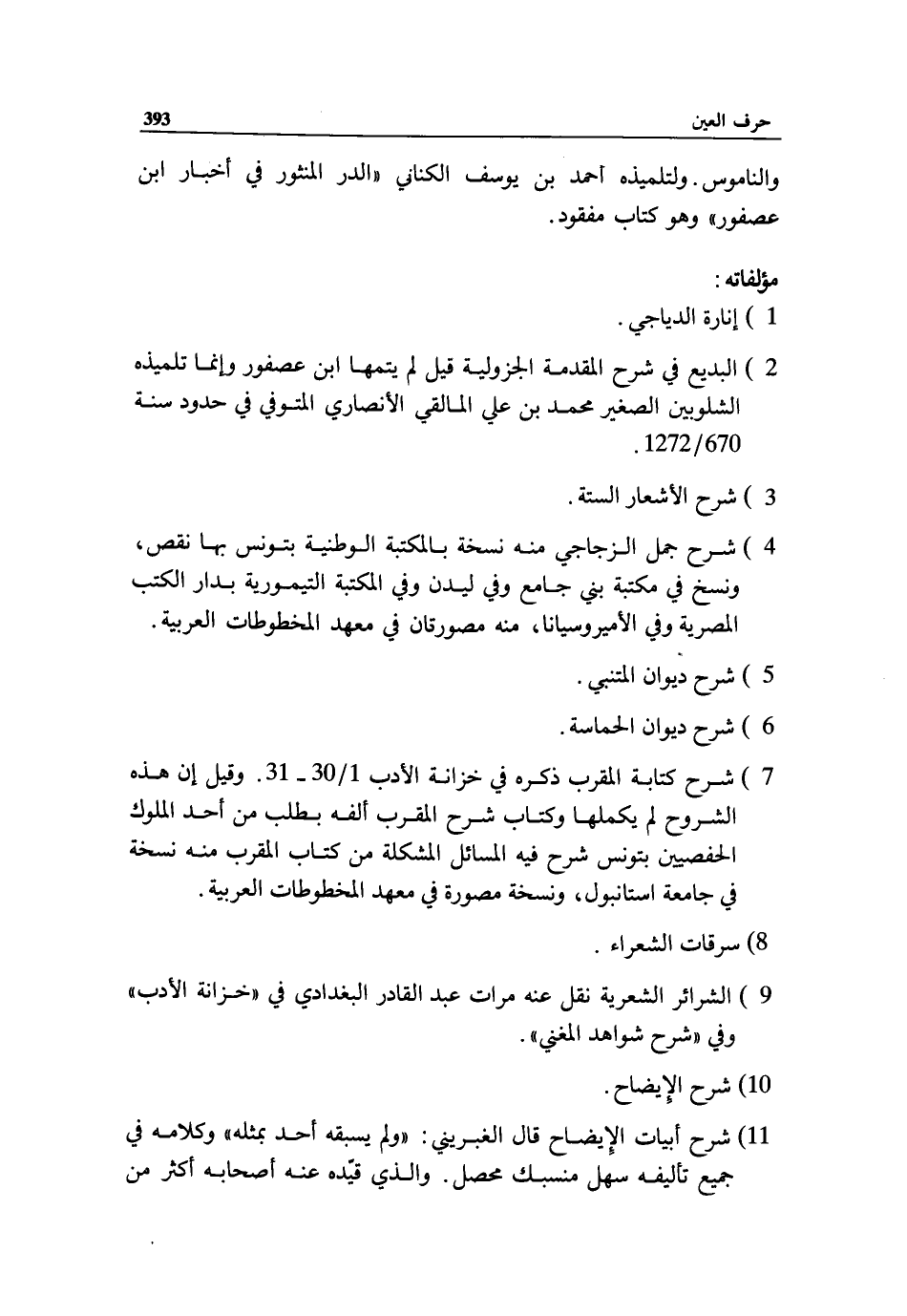4) شرح جمل الزجاجي منه نسخة بالمكتبة الوطنية بتونس بها نقص، ونسخ في مكتبة بني جامع وفي ليدن وفي المكتبة التيمورية بدار الكتب المصرية وفي الأمير وسيانا، منه مصورتان في معهد المخطوطات العربية.