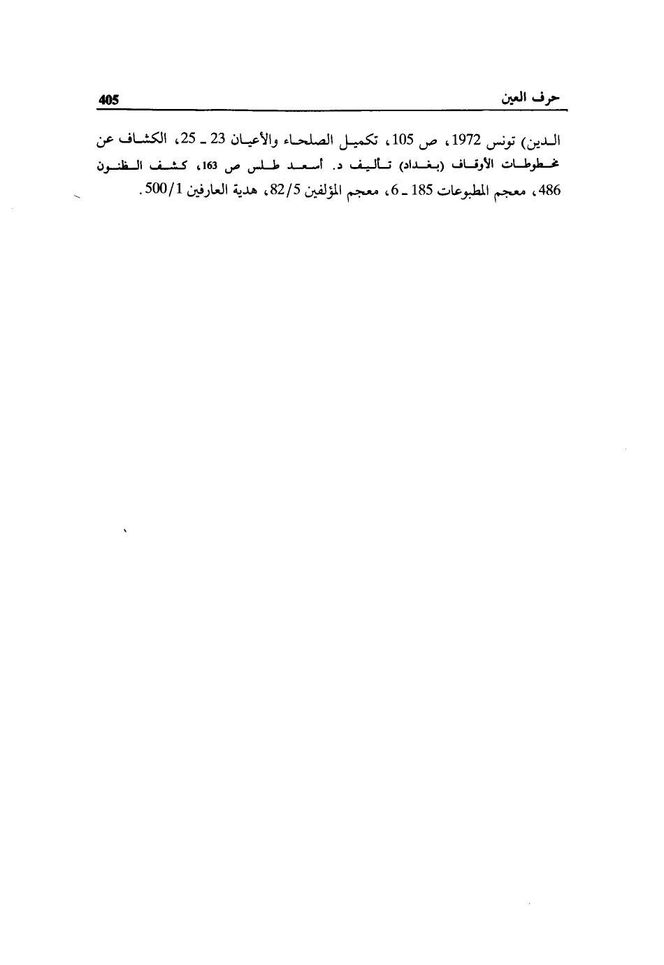 الدين) تونس 1972، ص 105، تكميل الصلحاء والأعيان 23 - 25، الكشاف عن مخطوطات الأوقاف (بغداد) تأليف د. أسعد طلس ص 163، كشف الظنون 486، معجم المطبوعات 185 - 6، معجم المؤلفين 5/ 82، هدية العارفين 1/ 500.