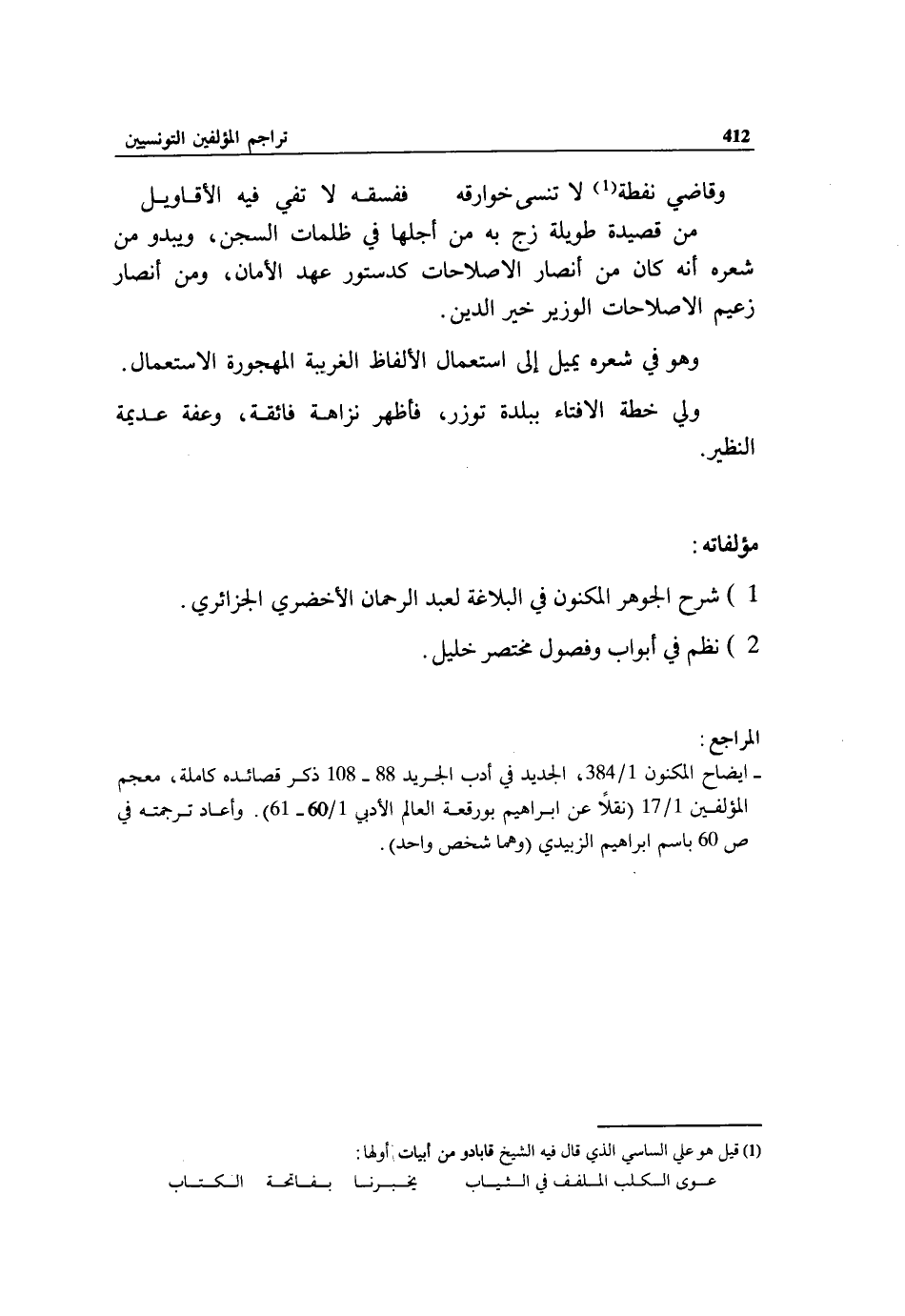 - ايضاح المكنون 1/ 384، الجديد في أدب الجريد 88 - 108 ذكر قصائده كاملة، معجم المؤلفين 1/ 17 (نقلا عن ابراهيم بو رقعة العالم الأدبي 1/ 60 - 61). وأعاد ترجمته في ص 60 باسم ابراهيم الزبيدي (وهما شخص واحد).