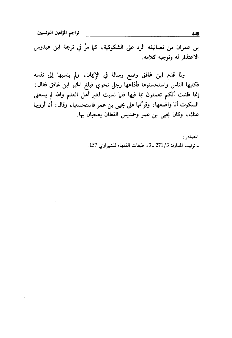 بن عمران من تصانيفه الرد على الشكوكية، كما مرّ في ترجمة ابن عبدوس الاعتذار له وتوجيه كلامه.