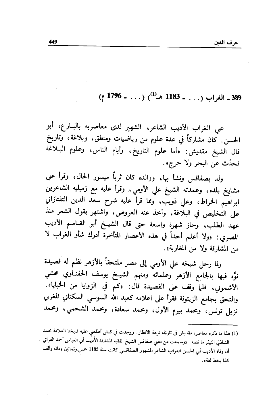 (¬1) هذا ما ذكره معاصره مقديش في تاريخه نزهة الأنظار. ووجدت في كنش أطلعني عليه شيخنا العلامة محمد الشاذلي النيفر ما نصه: «وسمعت من مفتي صفاقس الشيخ الفقيه المشارك الأديب أبي العباس أحمد الفراتي أن وفاة الأديب أبي الحسن الغراب الشاعر المشهور الصفاقسي كانت سنة 1185 خمس وثمانين ومائة وألف كذا بخط ثقة».