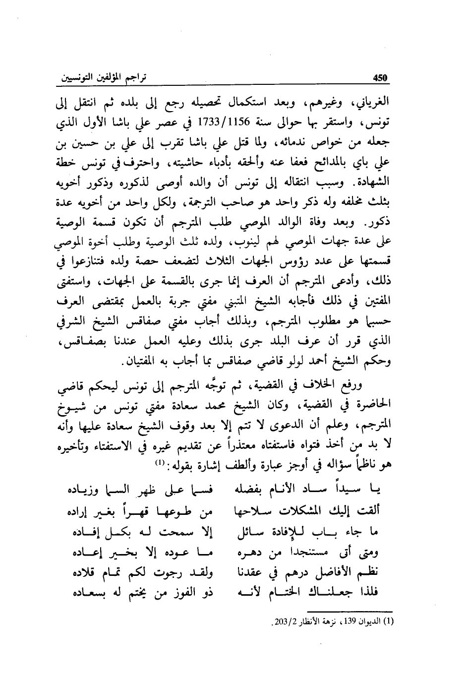 ورفع الخلاف في القضية، ثم توجّه المترجم إلى تونس ليحكم قاضي الحاضرة في القضية، وكان الشيخ محمد سعادة مفتي تونس من شيوخ المترجم، وعلم أن الدعوى لا تتم إلا بعد وقوف الشيخ سعادة عليها وأنه لا بد من أخذ فتواه فاستفتاه معتذرا عن تقديم غيره في الاستفتاء وتأخيره هو ناظما سؤاله في أوجز عبارة وألطف إشارة بقوله: (¬1)