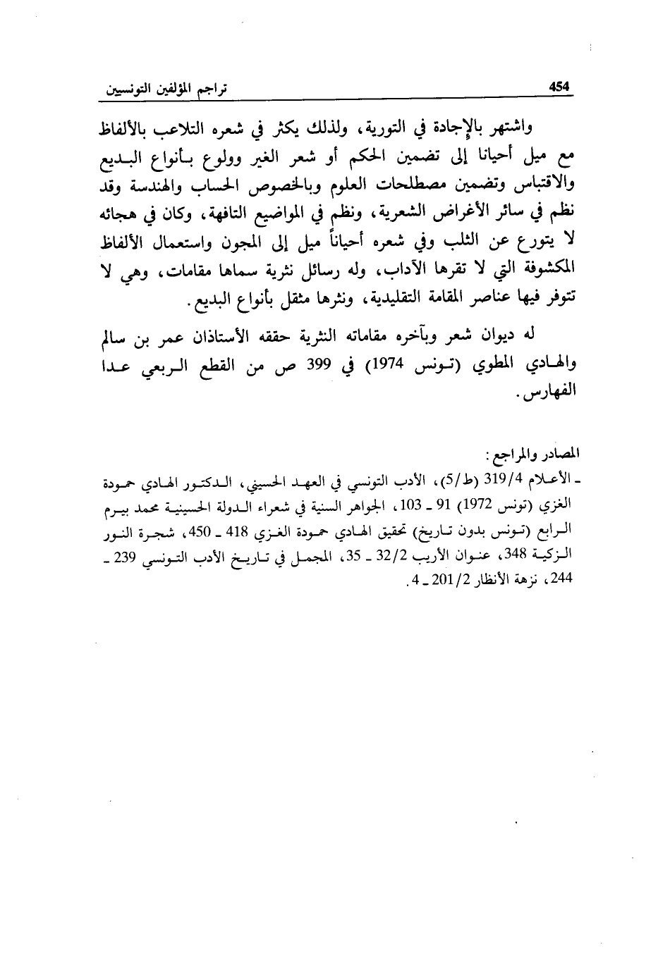 - الأعلام 4/ 319 (ط 5/)، الأدب التونسي في العهد الحسيني، الدكتور الهادي حمودة الغزي (تونس 1972) 91 - 103، الجواهر السنية في شعراء الدولة الحسينية محمد بيرم الرابع (تونس بدون تاريخ) تحقيق الهادي حمودة الغزي 418 - 450، شجرة النور الزكية 348، عنوان الأريب 2/ 32 - 35، المجمل في تاريخ الأدب التونسي 239 - 244، نزهة الأنظار 2/ 201 - 4.