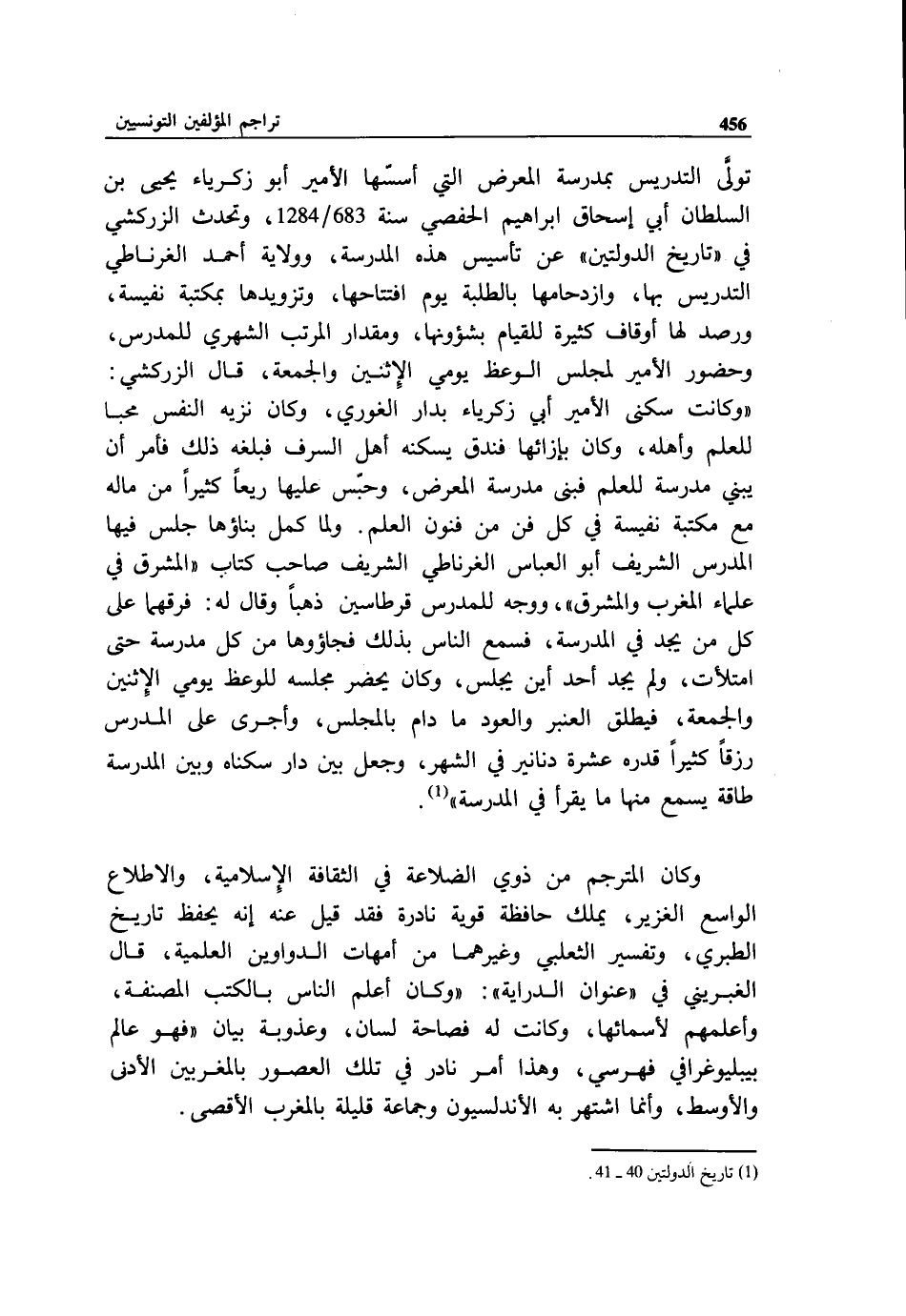 «وكانت سكنى الأمير أبي زكرياء بدار الغوري، وكان نزيه النفس محبا للعلم وأهله، وكان بإزائها فندق يسكنه أهل السرف فبلغه ذلك فأمر أن يبني مدرسة للعلم فبنى مدرسة المعرض، وحبّس عليها ريعا كثيرا من ماله مع مكتبة نفيسة في كل فن من فنون العلم. ولما كمل بناؤها جلس فيها المدرس الشريف أبو العباس الغرناطي الشريف صاحب كتاب «المشرق في علماء المغرب والمشرق»، ووجه للمدرس قرطاسين ذهبا وقال له: فرقهما على كل من يجد في المدرسة، فسمع الناس بذلك فجاءوها من كل مدرسة حتى امتلأت، ولم يجد أحد أين يجلس، وكان يحضر مجلسه للوعظ يومي الاثنين والجمعة، فيطلق العنبر والعود ما دام بالمجلس، وأجرى على المدرس رزقا كثيرا قدره عشرة دنانير في الشهر، وجعل بين دار سكناه وبين المدرسة طاقة يسمع منها ما يقرأ في المدرسة» (¬1).