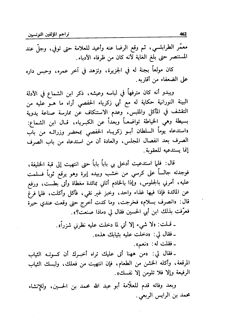 «استدعاه يوما السلطان أبو زكرياء الحفصي بمحضر وزرائه من باب الصرف بعد انفصال المجلس، والعادة أن من استدعاه من باب الصرف إنما يستدعيه للعقوبة.
