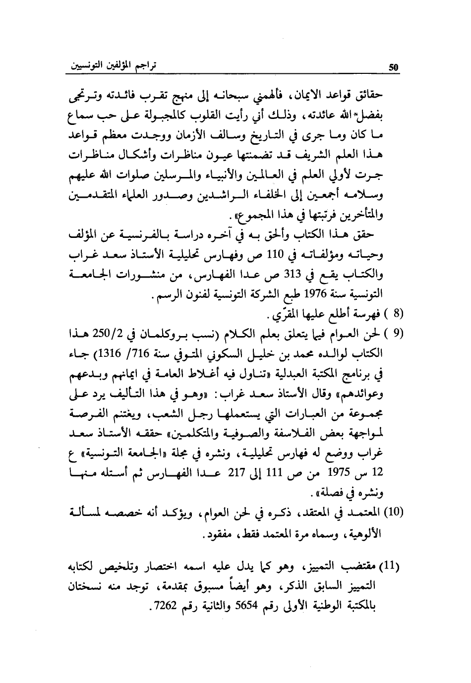 (9) لحن العوام فيما يتعلق بعلم الكلام (نسب بروكلمان في 2/ 250 هذا الكتاب لوالده محمد بن خليل السكوني المتوفي سنة 716/ 1316) جاء في برنامج المكتبة العبدلية «تناول فيه أغلاط العامة في ايمانهم وبدعهم وعوائدهم» وقال الأستاذ سعد غراب: «وهو في هذا التأليف يرد على مجموعة من العبارات التي يستعملها رجل الشعب، ويغتنم الفرصة لمواجهة بعض الفلاسفة والصوفية والمتكلمين» حققه الأستاذ سعد غراب ووضع له فهارس تحليلية، ونشره في مجلة «الجامعة التونسية» ع 12 س 1975 من ص 111 إلى 217 عدا الفهارس ثم أستله منها ونشره في فصلة».