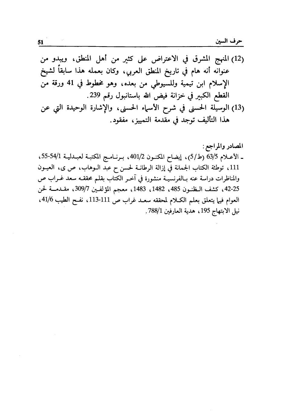 (13) الوسيلة الحسنى في شرح الأسماء الحسنى، والإشارة الوحيدة التي عن هذا التأليف توجد في مقدمة التمييز، مفقود.