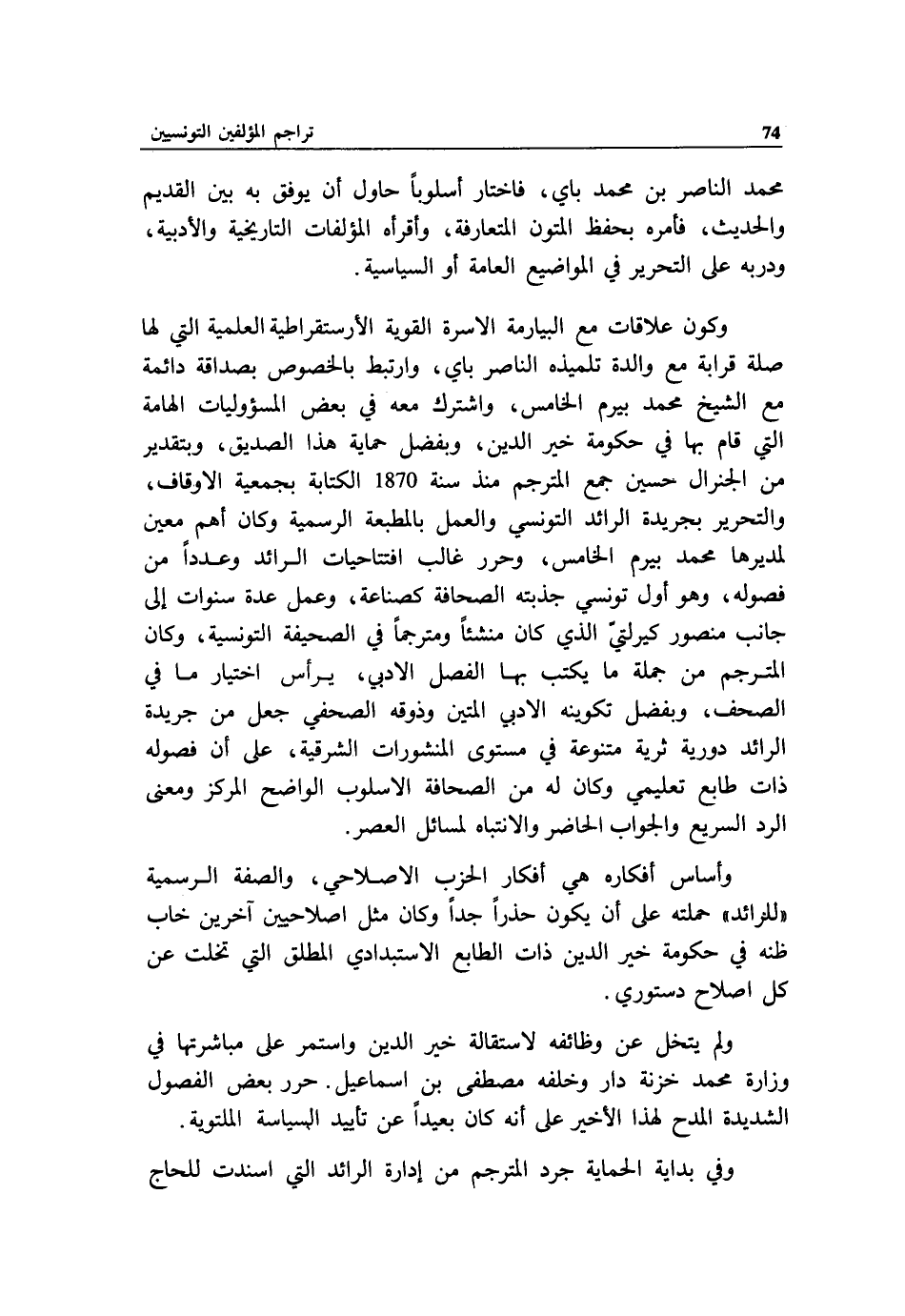 وأساس أفكاره هي أفكار الحزب الاصلاحي، والصفة الرسمية «للرائد» حملته على أن يكون حذرا جدا وكان مثل اصلاحيين آخرين خاب ظنه في حكومة خير الدين ذات الطابع الاستبدادي المطلق التي تخلت عن كل اصلاح دستوري.